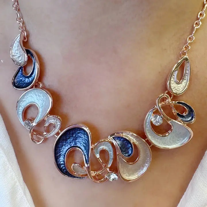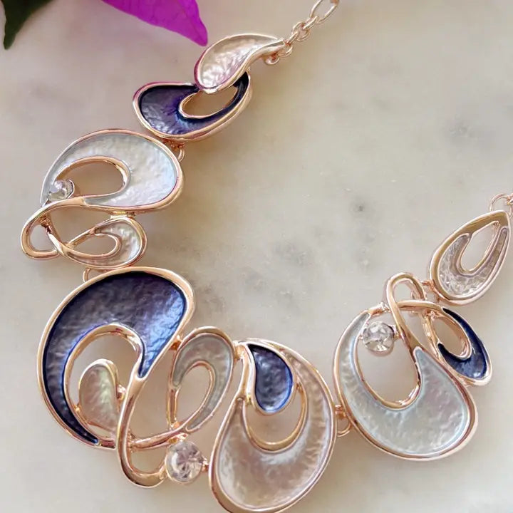 This stunning rose gold necklace is the perfect necklace for women. Buy for yourself and have people ask where you got it, or give it as a gift for someone special. Made from nickel free, environmentally friendly alloy, plated in high quality tarnish resistant rose gold plating and features clear crystals and shimmery enamels in colours of purple, beige and silver. Light weight to wear and oh so fun. The many colours in this necklace lends itself to be worn with many outfits and colour palettes. Tarnish resistant. Length 18" plus 2" extension.