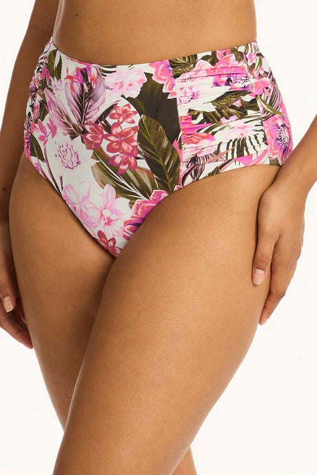 Sea Level Isla High Waist Gathered Side Pant White Pink Floral 10