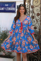 Flirty and fun, this babydoll mini dress features a charming tie-front closure and playful contrast trim along the hems. The dreamy blue and red floral print brings a whimsical touch to your wardrobe, perfect for those who love a little sweetness with their style.