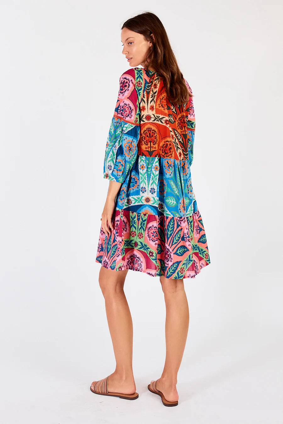 Astound in the undeniably beautiful Poetta Tiered Dress with its intricate patchwork of colours and cascading tiers. Pair with a statement sandal or heels for effortless beauty.