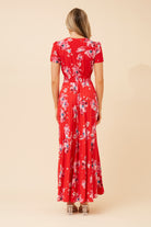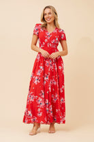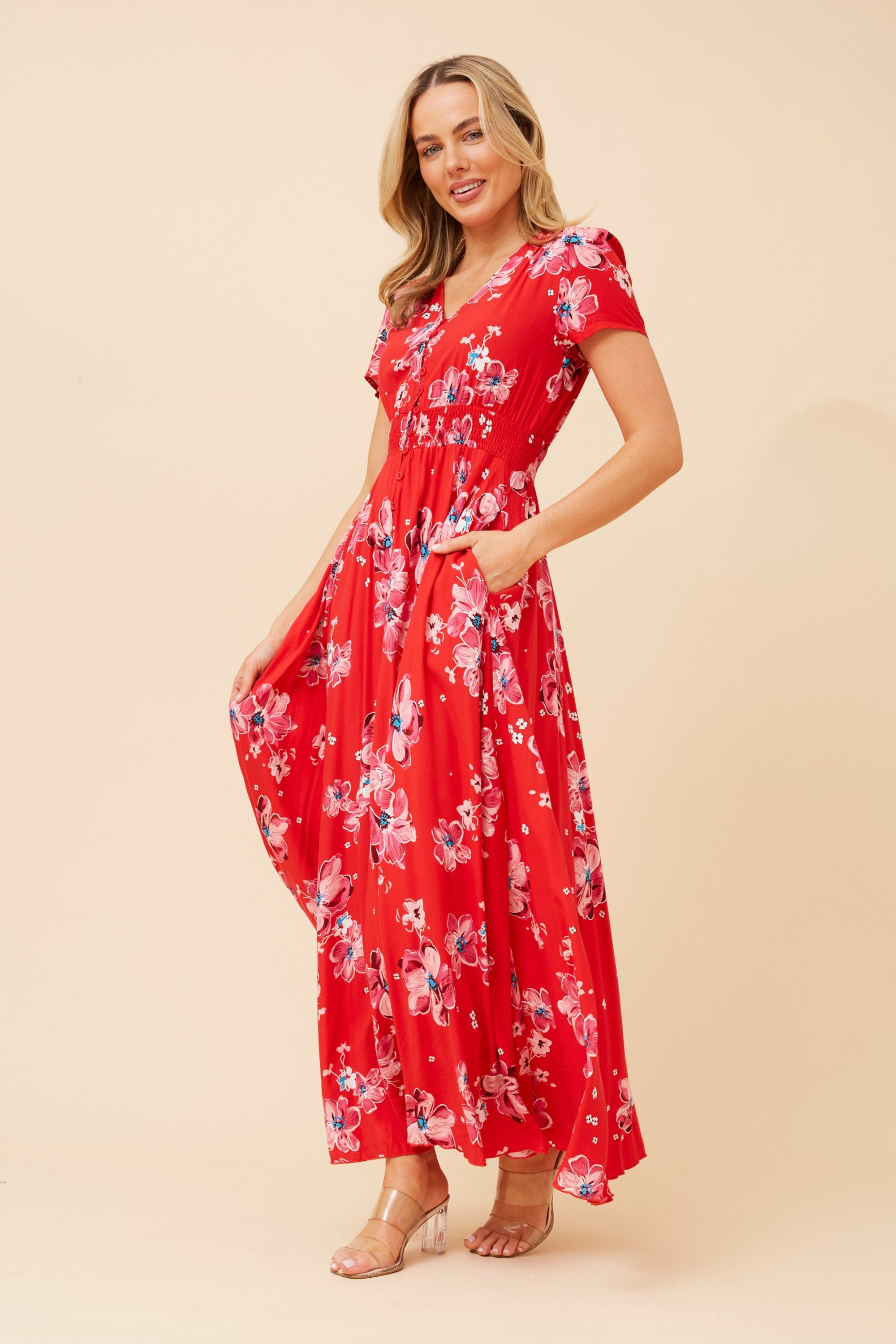 Caroline Morgan Cap Sleeve Floral Buton Through Maxi with shirred waistband Red Floral 8
