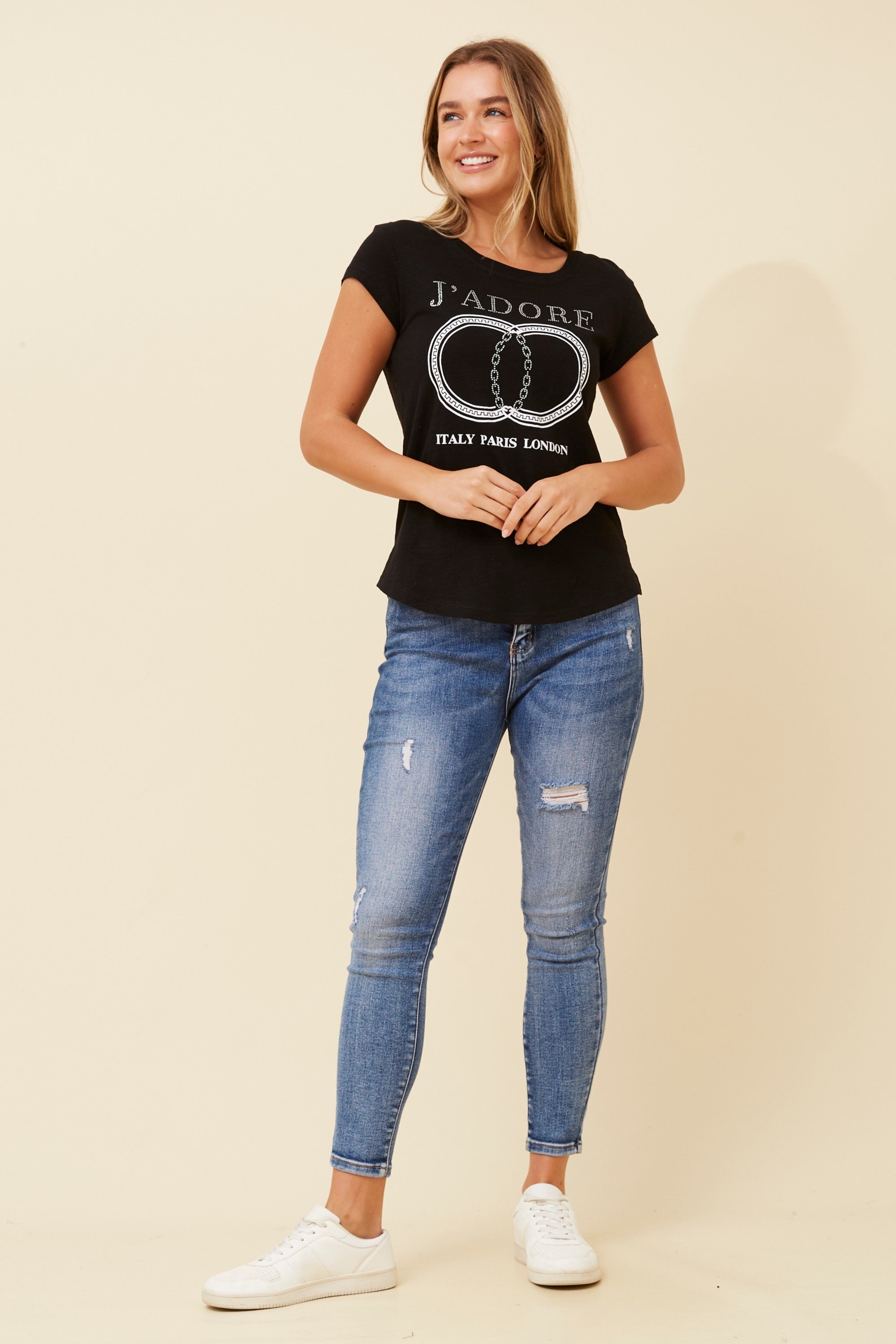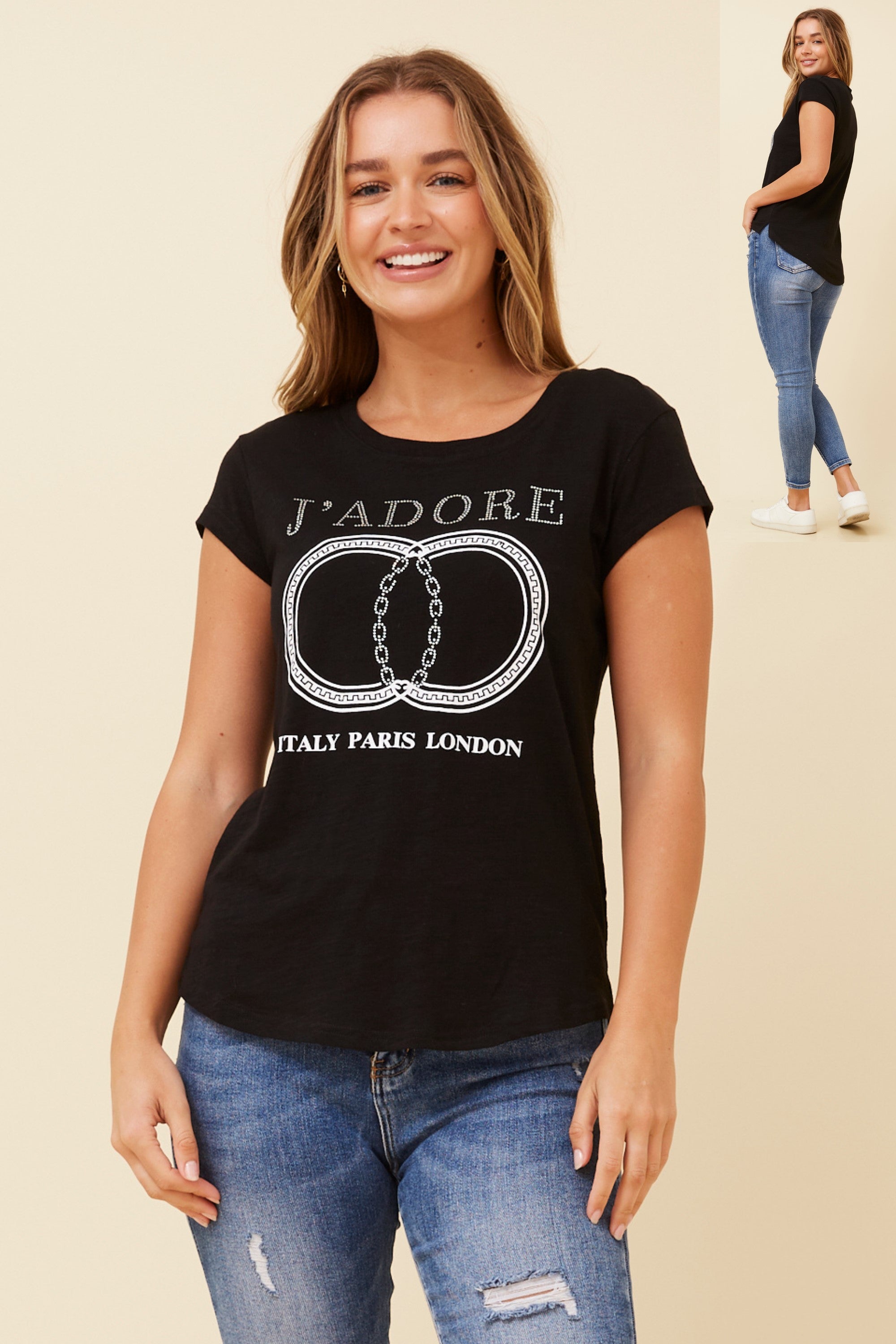 Elevate your everyday essentials with this 'JADORE' adorned graphic t-shirt, perfect for staying fashionable and comfortable this season.  Create an easy going and laid-back ensemble with jeans, shorts, or skirts.