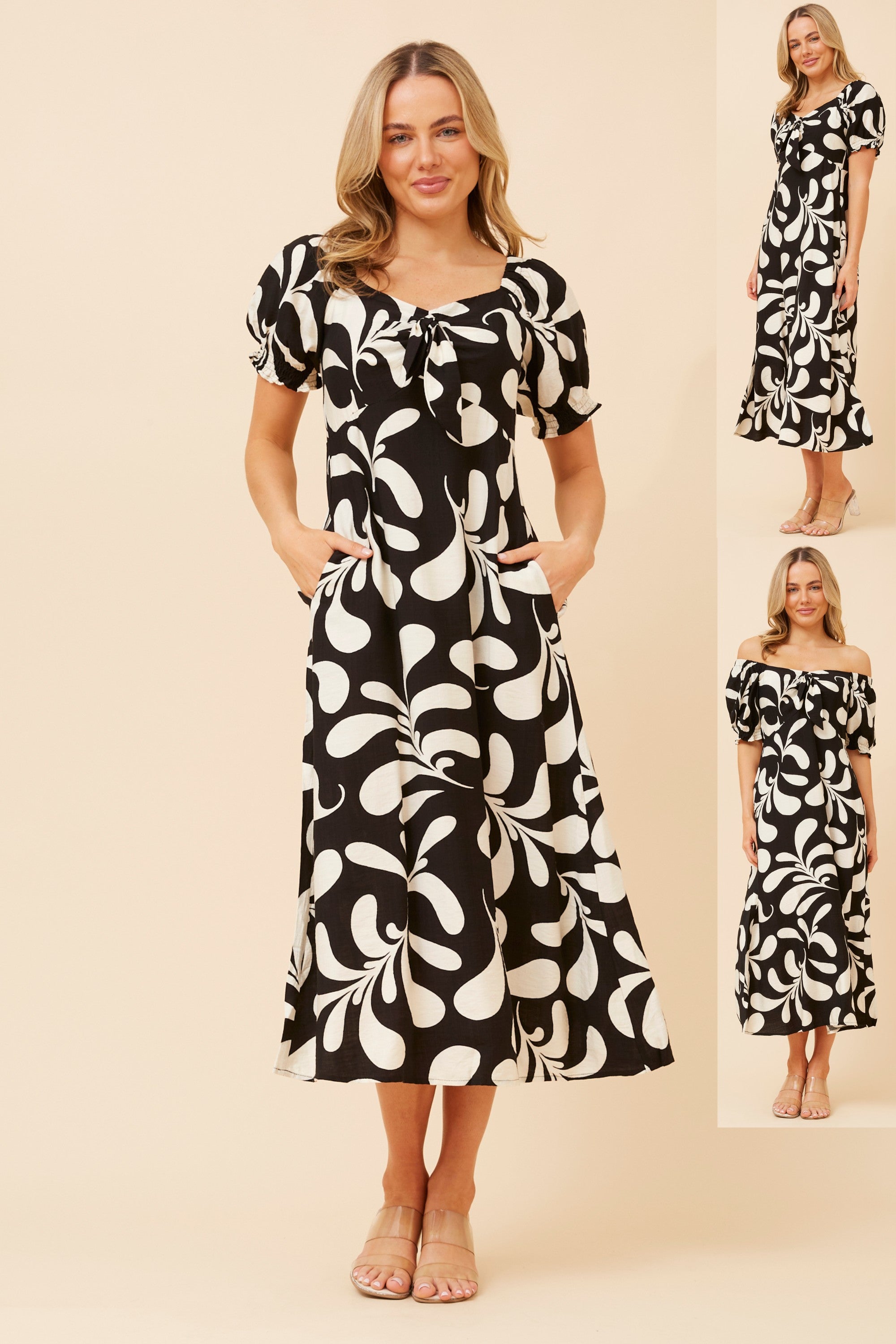 Caroline Morgan Short Puff sleeve printed front knot midi dress Cream Black Floral 8