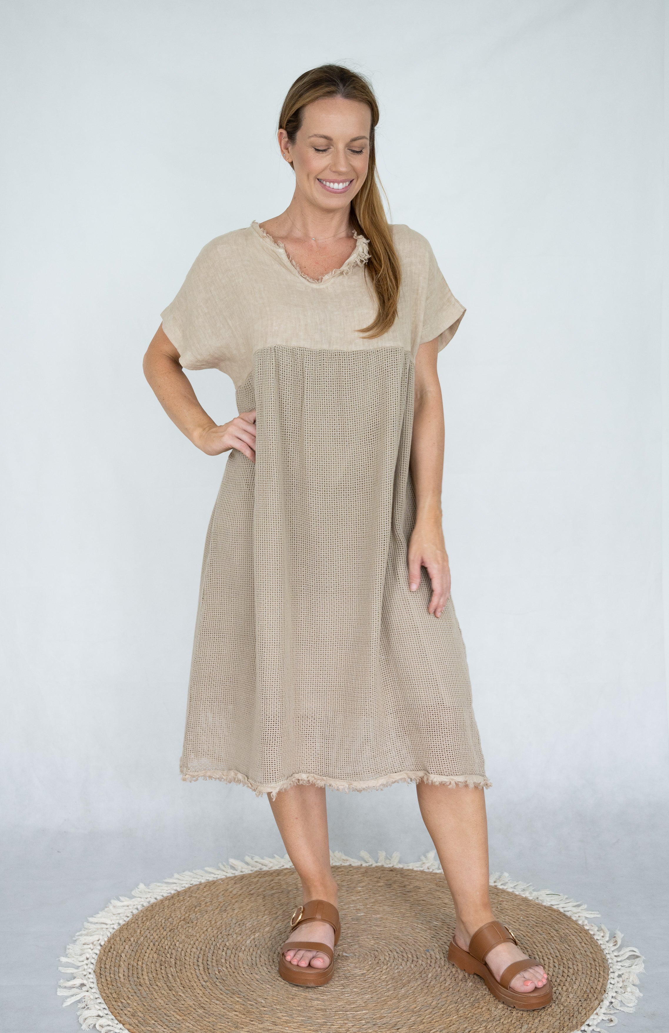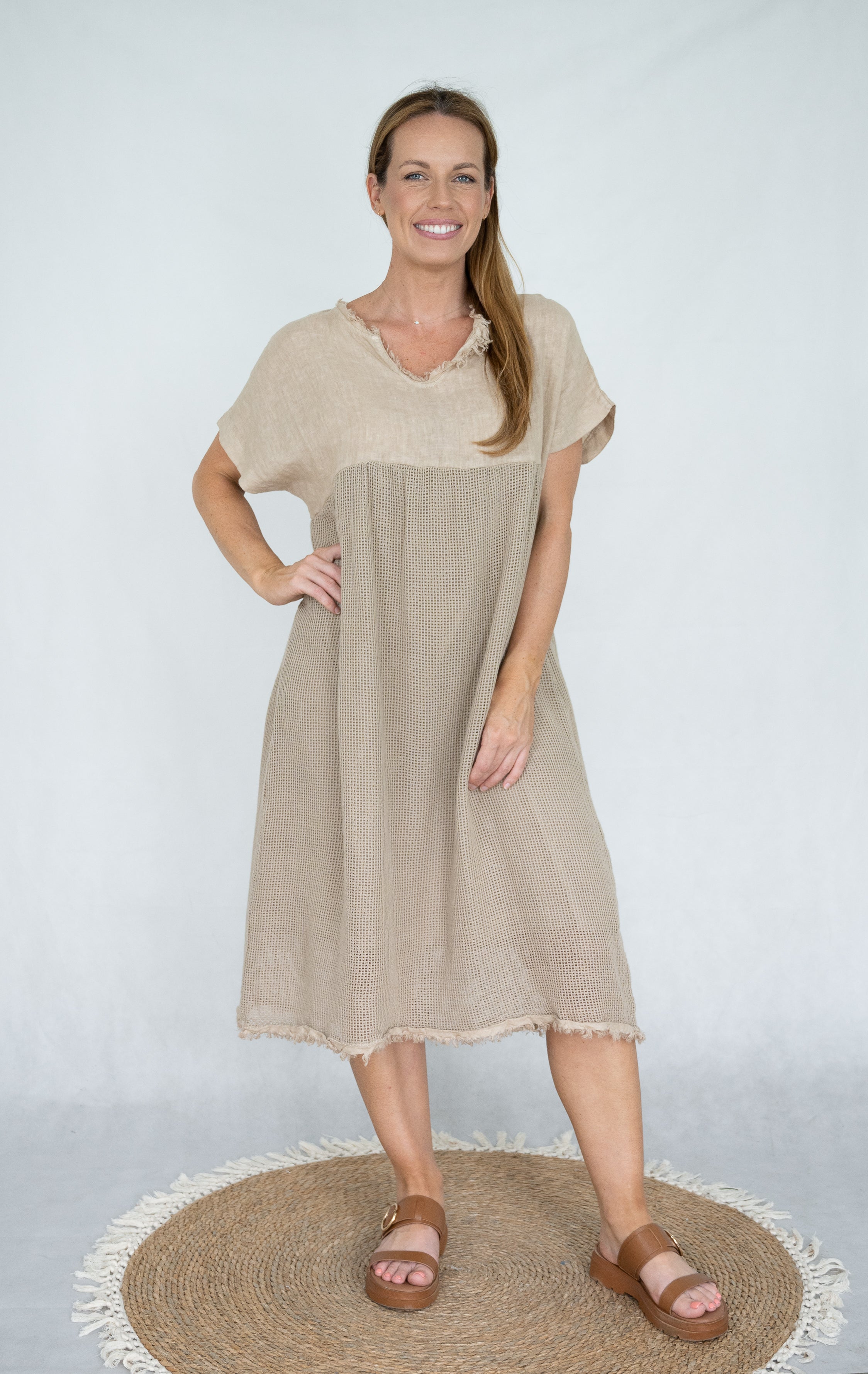 Cielo di Milano Linen Fringed Detail Short Sleeve Dress Sand S