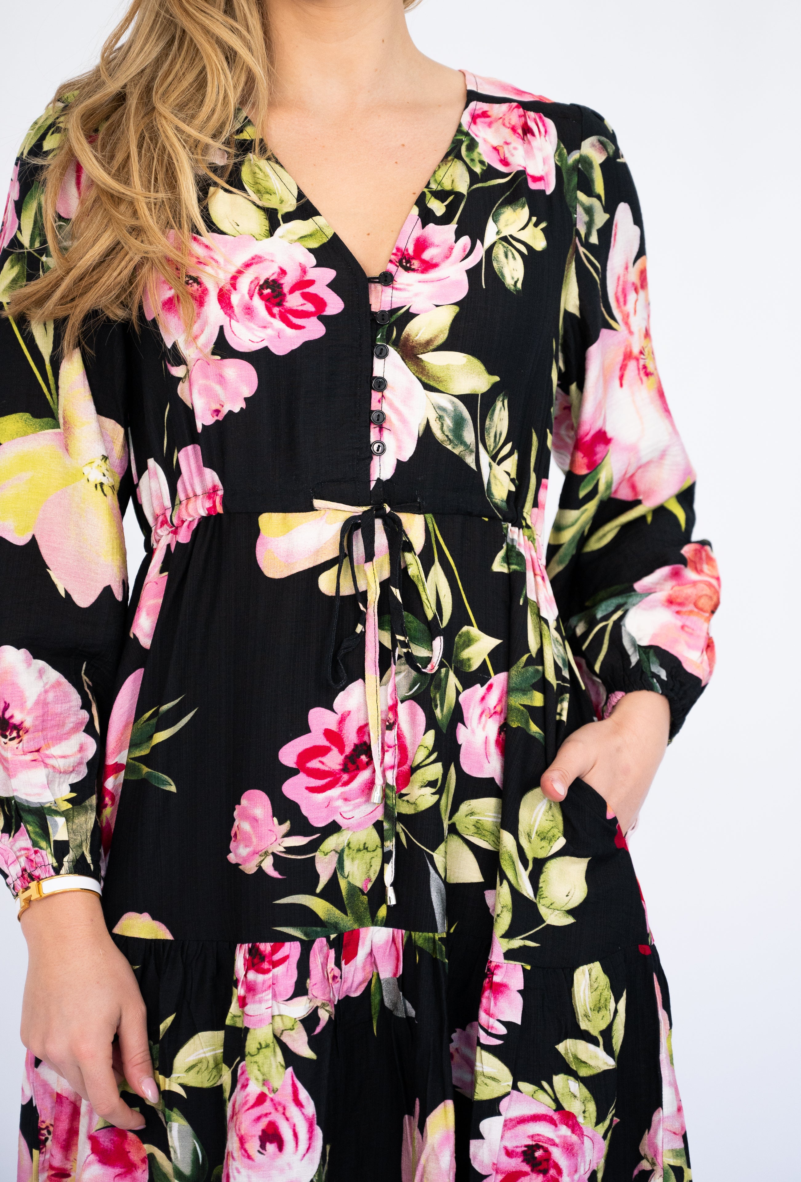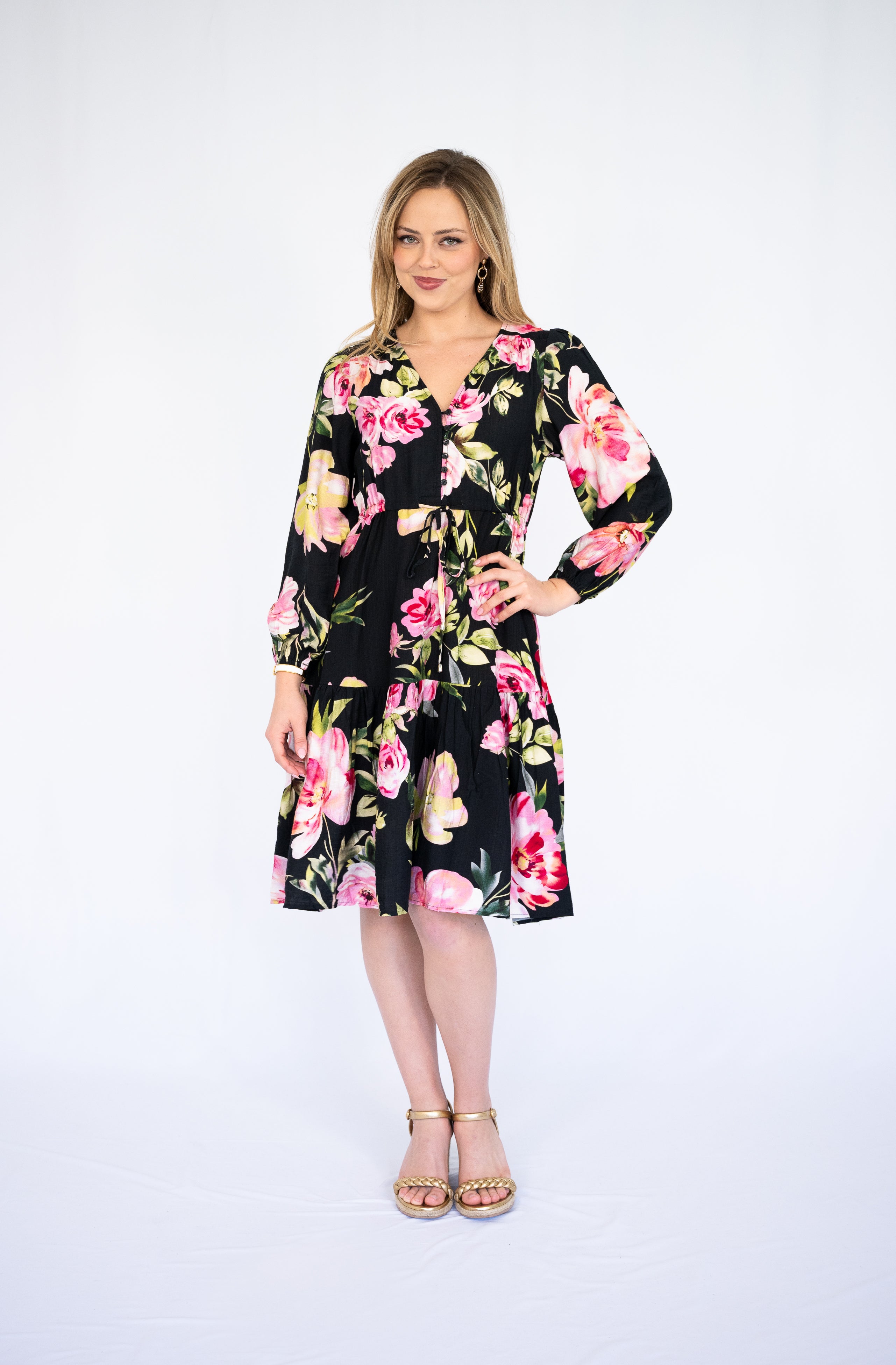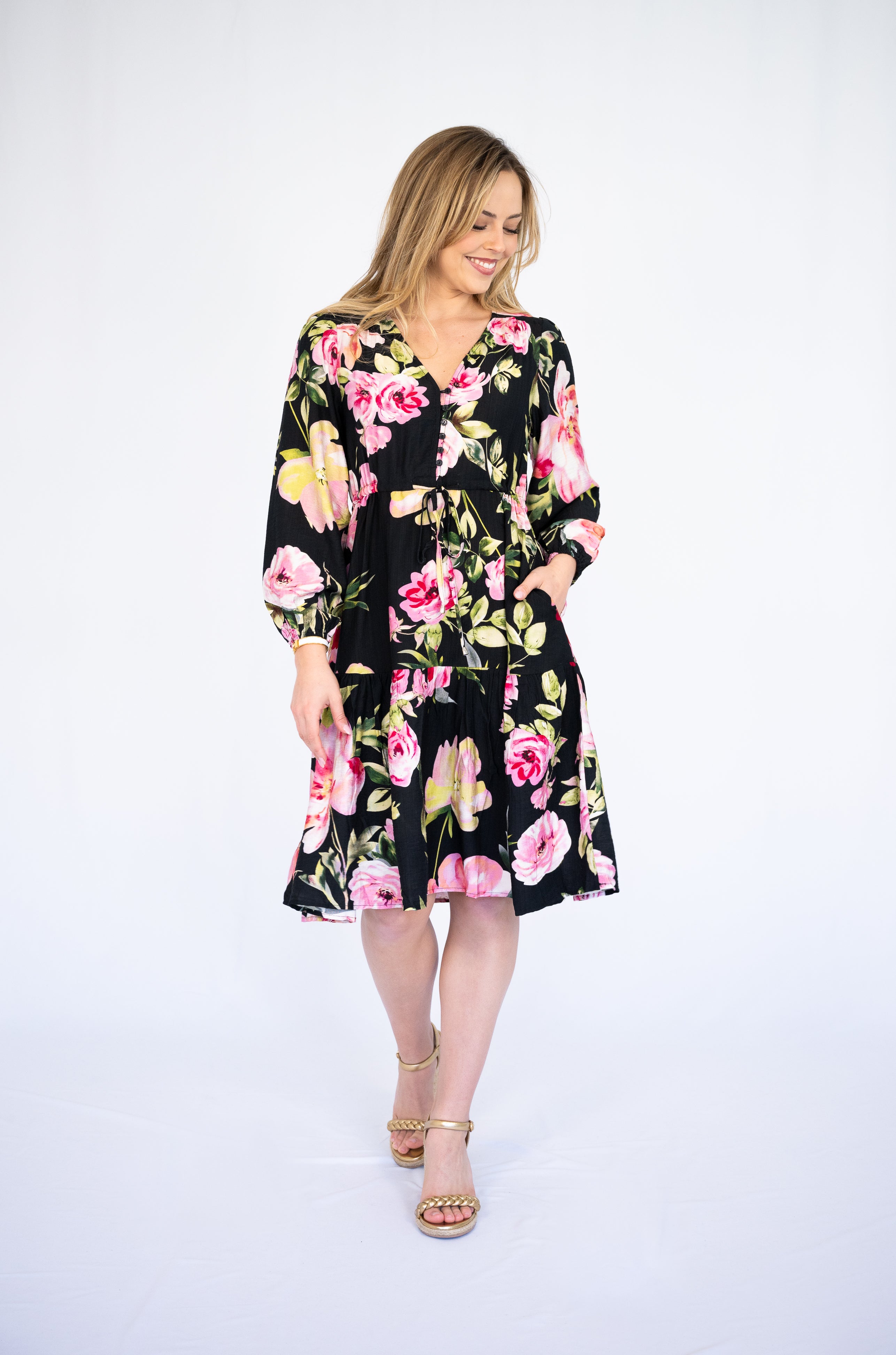 Elegant floral design with a refined tie detail above the waist, this best-selling dress offers a flattering silhouette. Perfectly complemented by boots or heels for a polished, sophisticated look.