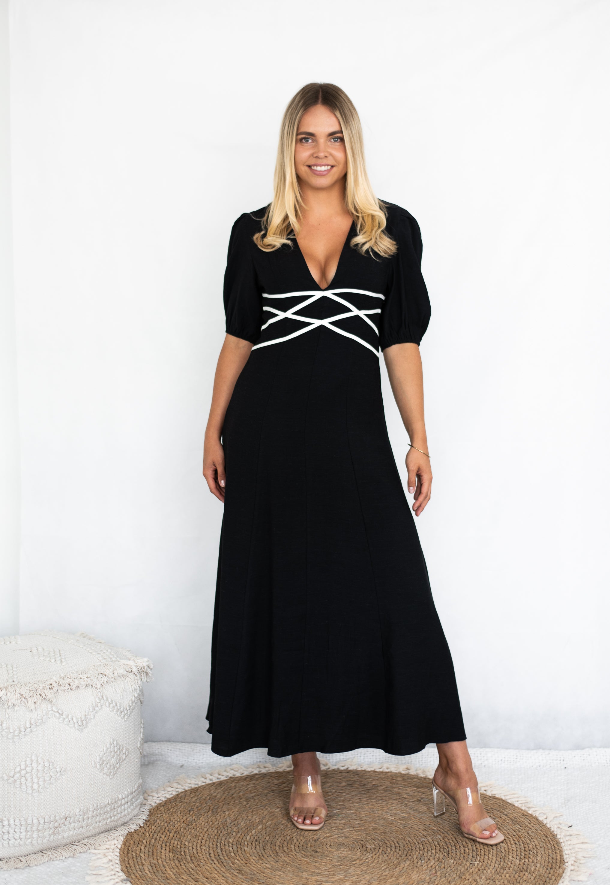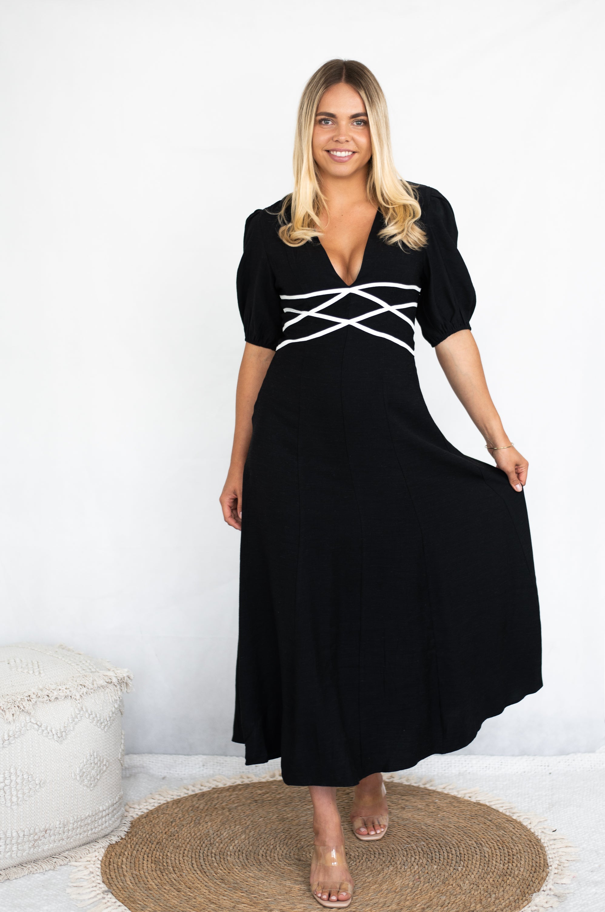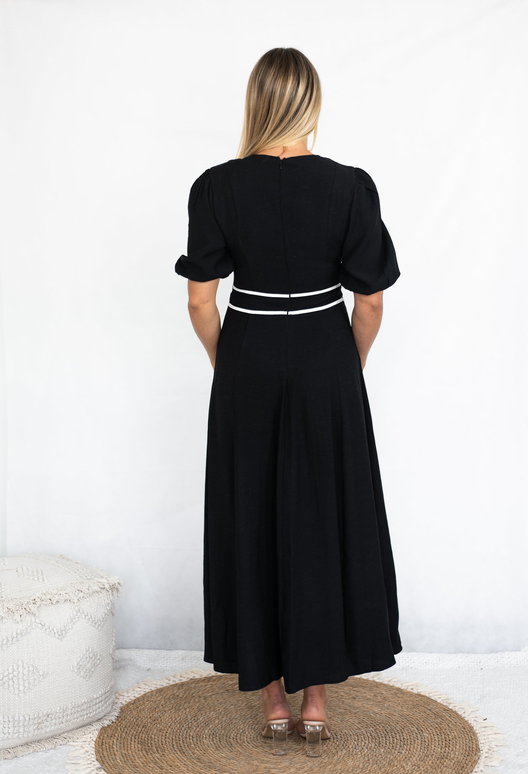 Fria Linen Blend Grecian Tape Detail Midi Dress Black White 6