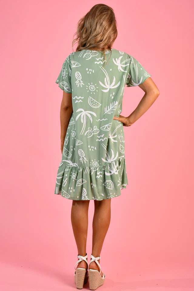 Go Girl Cap Sleeve Button Dress Tropical Fiesta Sage Sage S