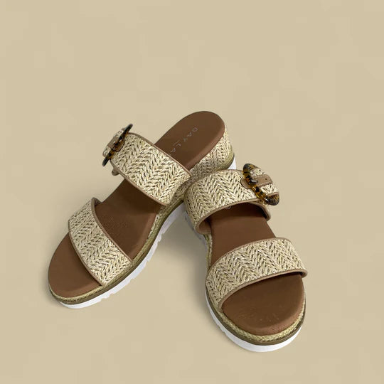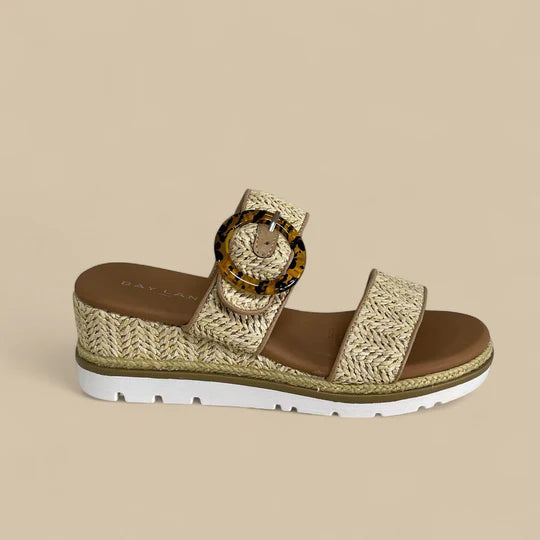Step into effortless summer style with these chic Bay Lane Riverton woven wedge sandals. Designed for both comfort and sophistication, they feature a natural raffia-inspired texture and two wide supportive straps for a secure fit. The upper strap is accented with a bold buckle, adding a refined touch to this casual silhouette. A soft cushioned footbed ensures all-day wearability, while the sturdy wedge heel provides just the right amount of lift for a flattering look.