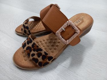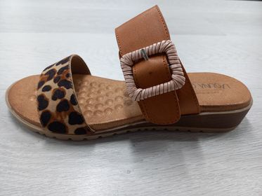 Laguna Quays Milo Slide features a comfortable double strap in leopard print and tan. Stylish wrapped buckle gives added interest.