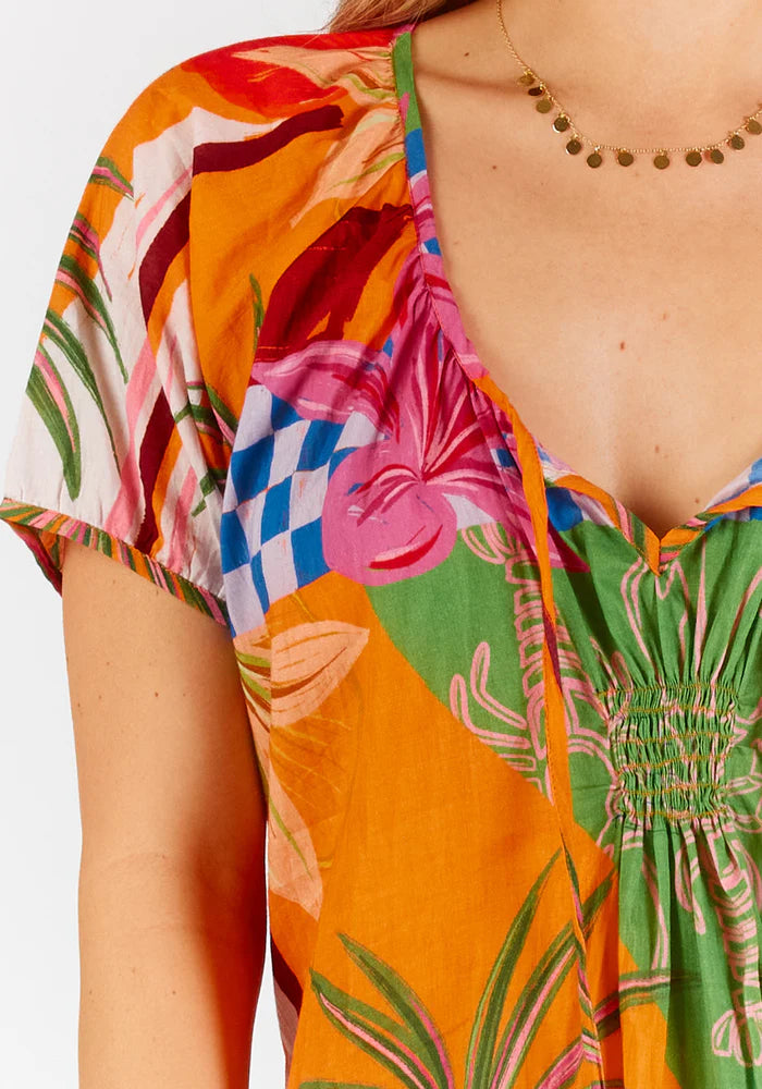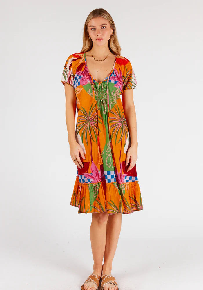The Vivien Dress offers a relaxed fit, perfect for laid-back summer days. It features a v neck with ties and shirring under the bust for added shape. The short loose sleeves provide a breezy feel, while side pockets add practicality. The A-line shape and the tiered hem create a flattering, feminine silhouette, making this dress both comfortable and stylish.