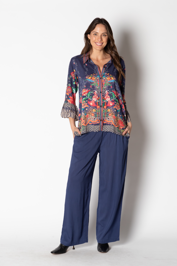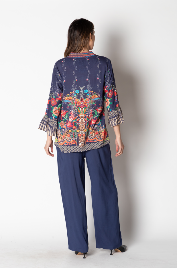 The Ximena Top boasts a chic shirt collar and button through design, perfect for any occasion. Made from 100% Rayon, this lightweight top features a stylish 3/4 sleeve with a delicate frill hem. Designed in Australia, it adds a touch of elegance to your wardrobe.