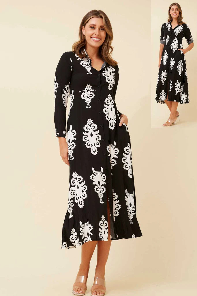 Caroline K Morgan Long Sleeve Printed Shirt Dress Black White 8