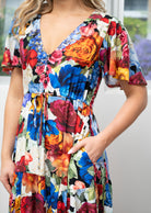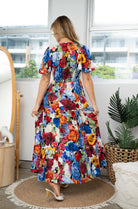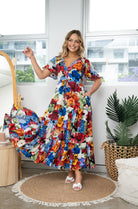 Discover effortless elegance with our Fria Selma Maxi Dress. The vibrant multi coloured floral print and button detail add a touch of sophistication, while the drawstring offers practicality. With waterfall sleeves and a tiered design, this dress exudes sophistication.
