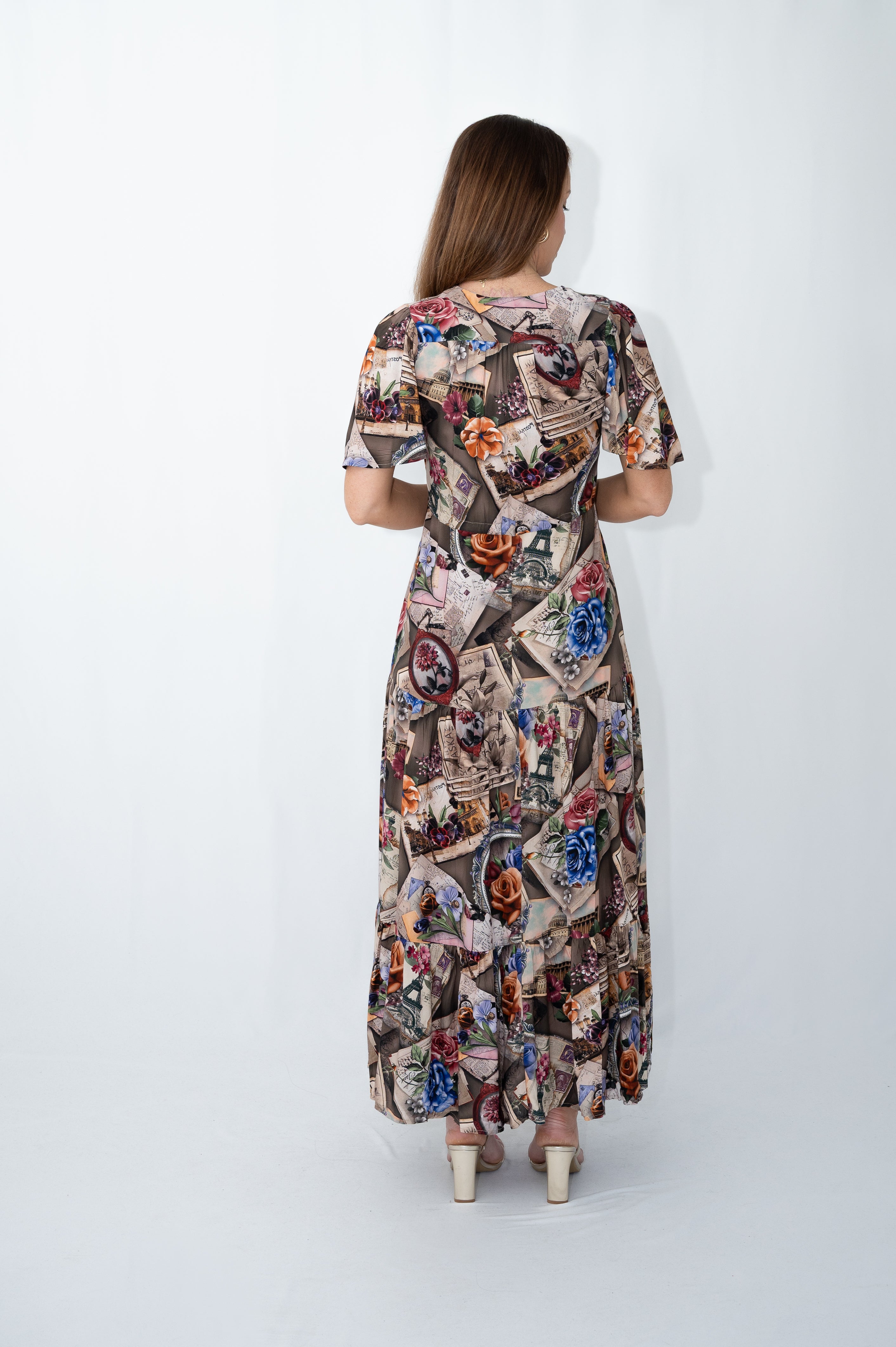 This eye catching and easy to wear Selma Maxi Dress in a new exquisite French collage print features a flattering v-neckline with a functional button through front, cinched waistline with drawstring, fluted sleeves with a tie, side seam pockets, and a flowing tiered design.