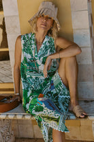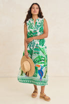 The Marquita Maxi Dress from Lula Life is both laid-back and jewel-like, all at once. A 100% cotton A-line maxi style, it has a banded round-into-V neckline with lace trim, a hemline curved up into side splits with ric rac trim, and in-seam side pockets fixed to the front panel. It showcases a vivid print on a crisp white background, of Asian-inspired tropical scenery, complete with toucans in bright colours. Pop it on with your comfiest slides and you are resort ready.... even if it's just pretending to be at the resort!