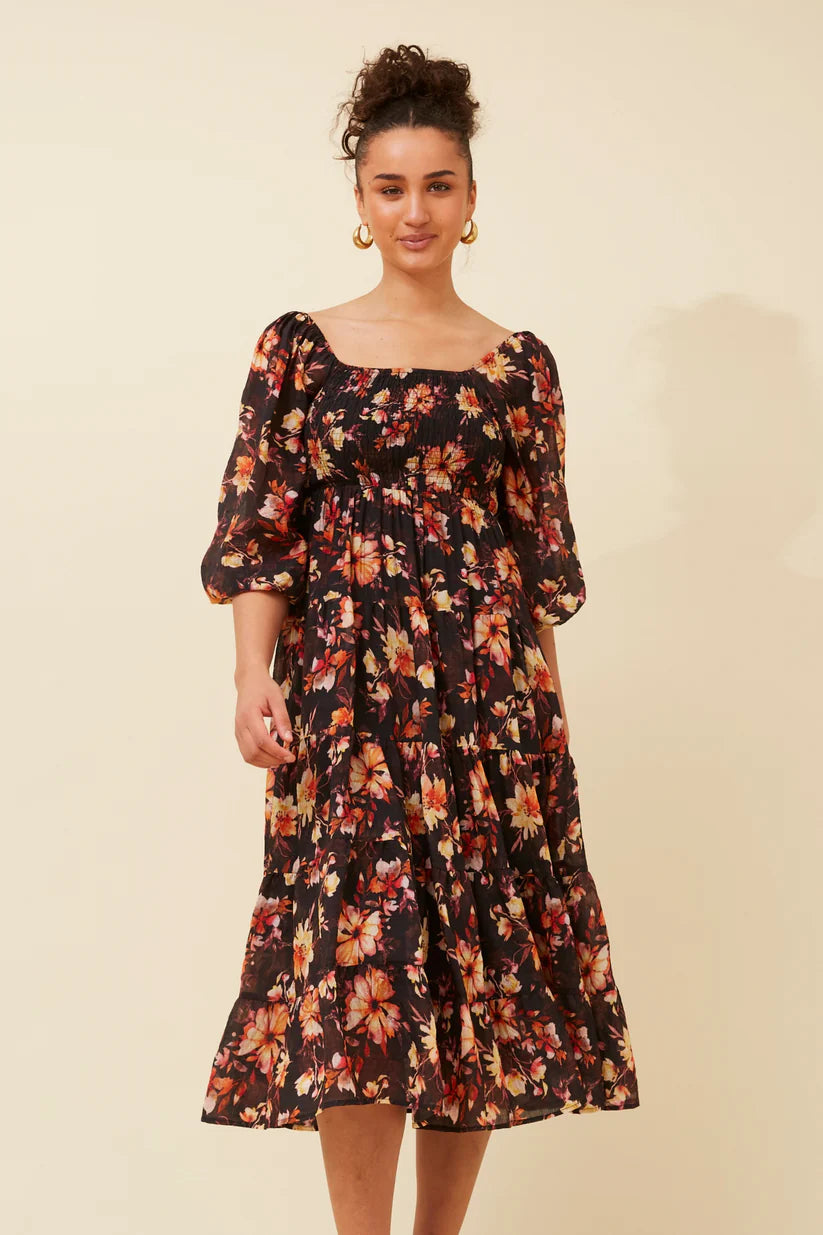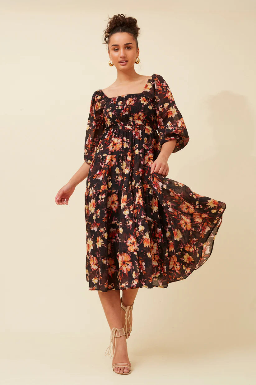 Caroline K Morgan Long Sleeve Printed Tiered Dress Black Floral 8