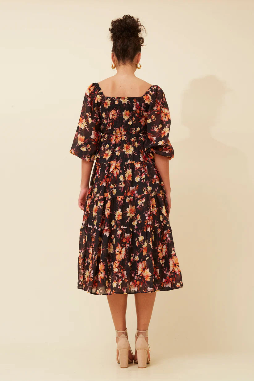 Get ready to bloom in this CKM Floral Midi Dress! With effortless femininity, this dress is perfect for any event. The square elastic neckline can be worn off the shoulder, while the 3/4th balloon sleeves with elastic cuffs add a playful touch. The floral print, tiered design, and midi length make this dress a must-have for any wardrobe. Viscose/Nylon outer, 100% cotton lining
