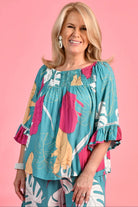 Bodacious Rouched Bell Sleeve Magic Monstera Teal Top