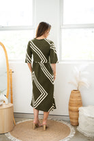 Embrace understated elegance with this refined dress, featuring a gracefully scooped waistline that flatters your silhouette. The sophisticated V-neckline and three-quarter sleeves offer timeless appeal, while an eye-catching geometric pattern in khaki tones adds contemporary visual interest. Perfect for elevating your everyday wardrobe with effortless style.