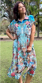 Effortless elegance meets vibrant style with this stunning button-front midi dress. Crafted from soft, flowing viscose, it drapes beautifully to shin length for a flattering silhouette. The eye-catching Grecian blue digital print brings movement and personality to your wardrobe, while the classic collar and button front detail add timeless sophistication. Perfect for warm weather dressing, this piece transitions seamlessly from casual outings to special occasions. Slip it on and feel the luxe comfort of premium fabric that moves with you.