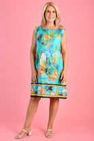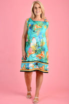 Introducing our St Gilies Dress! The epitome of fun with a thick strap and scoop neckline, this above-the-knee dress is perfect day dress! Paired with your favourite sandals or strappy heels, our Tropical Punch print is a stand out with the striped bottom detail !