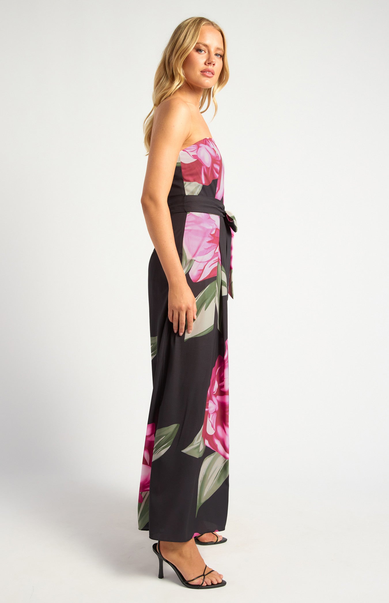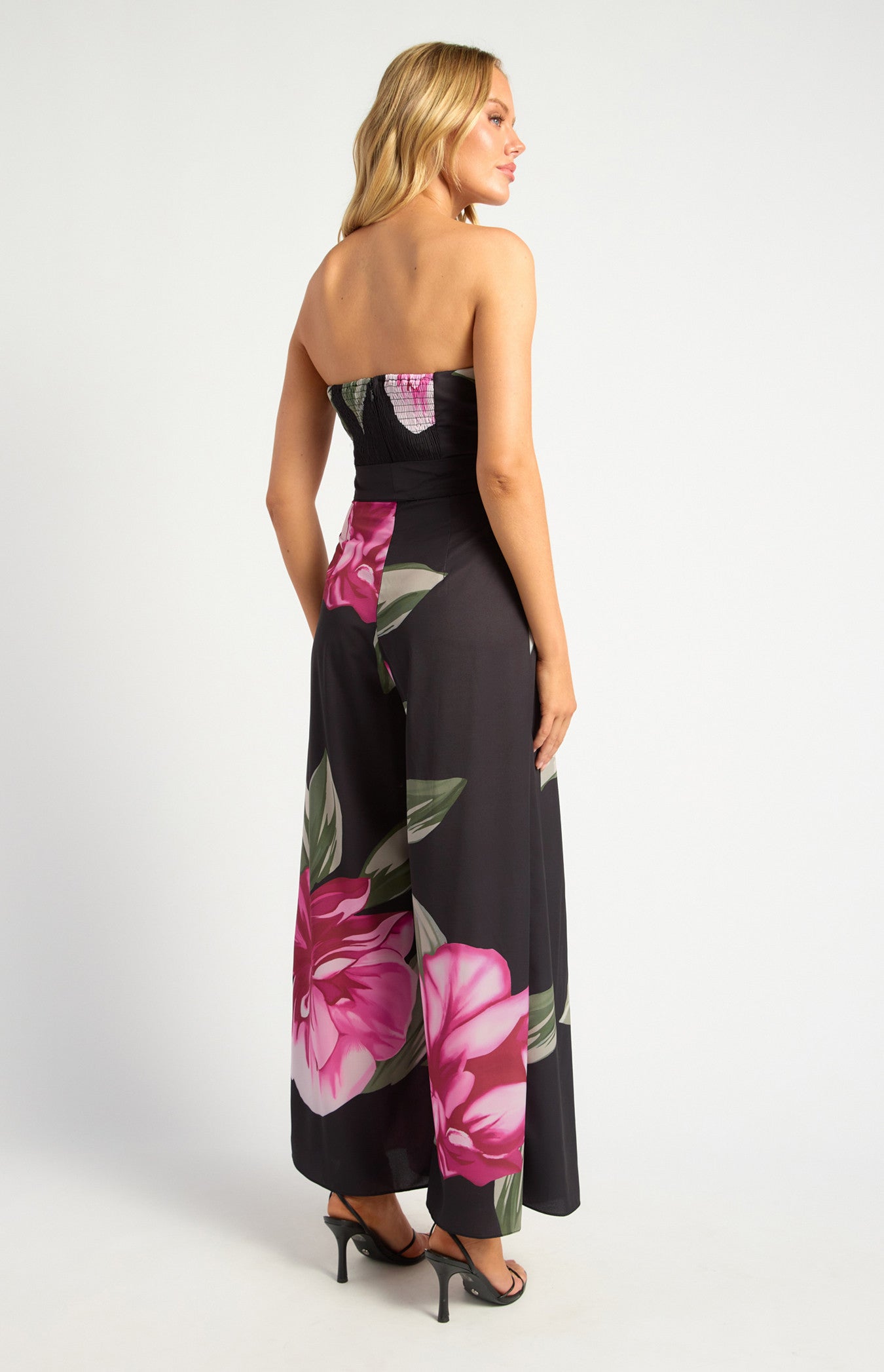 - This strapless jumpsuit features a delicate floral print on crepe fabric, with a fitted bodice enhanced by bust shaping and a shirred back panel. Adjustable straps and an anti-slip neckline ensure a secure fit. The wide-leg silhouette is defined by pleated front legs and a self-fabric waist tie for added elegance. Fully lined with a concealed back zip closure for a polished finish.