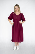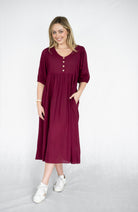Elevate your wardrobe with this Burgundy Peasant Style Dress. The rounded V neckline and 3/4 length sleeves with elasticated cuff exude sophistication, while the faux button detailing at the bust adds a touch of luxury. Function side pockets and a relaxed fit make this dress both practical and stylish. Made from a premium blend of viscose and linen, this midi length dress is perfect for any occasion. Consider sizing down for a slimmer fit.