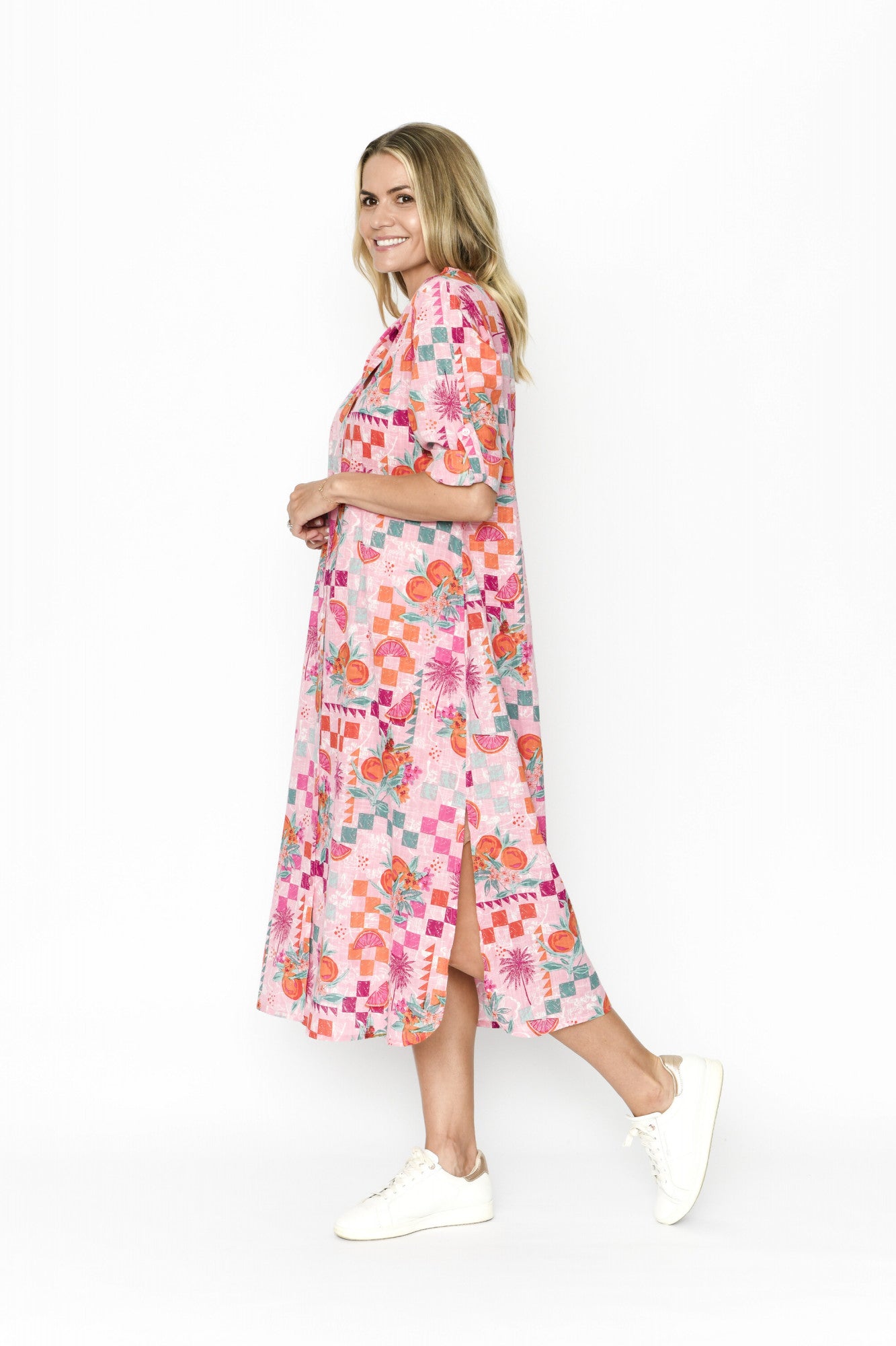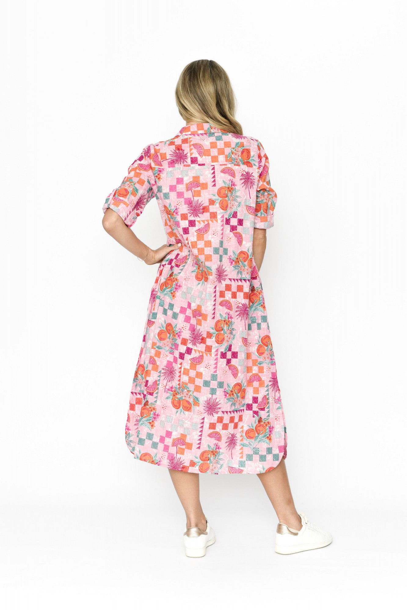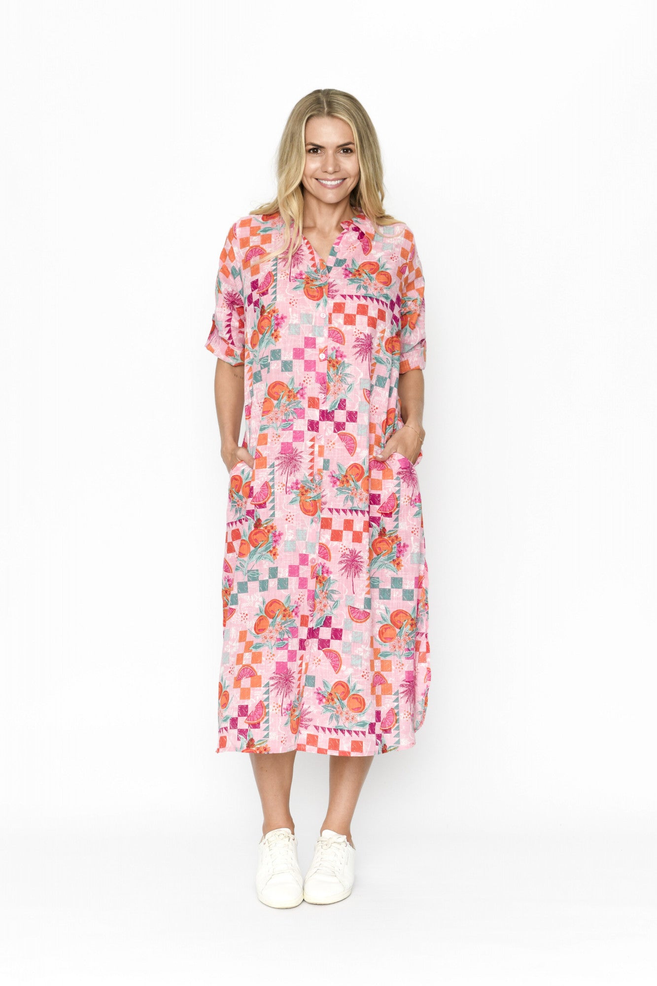 Introducing our summer staple Sofia made from cotton slub, this dress creates the feeling of comfort and versatility. Bright and cheery in this tropical pink print, Sofia is a perfect mix or feminine and chic! Featuring a collard neckline, built in pockets, ¾ sleeves, and button detailing. Making it a wardrobe staple.