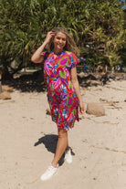 Bring effortless charm to your warm-weather wardrobe with the Leela V Neck Mini Dress. Crafted from lightweight, breathable 100% cotton, this mini dress features a playful, relaxed silhouette with a V-neckline and partial button placket for easy wear. The soft, short sleeves enhance the breezy feel, while the multi-tiered design creates volume and movement with every step. Whether you're heading to a brunch, beachside stroll, or a casual day out, this vibrant smock dress offers all-day comfort with a free-spirited, bohemian flair. Its vivid color palette and flowing shape make it the perfect throw-on-and-go piece for summer