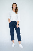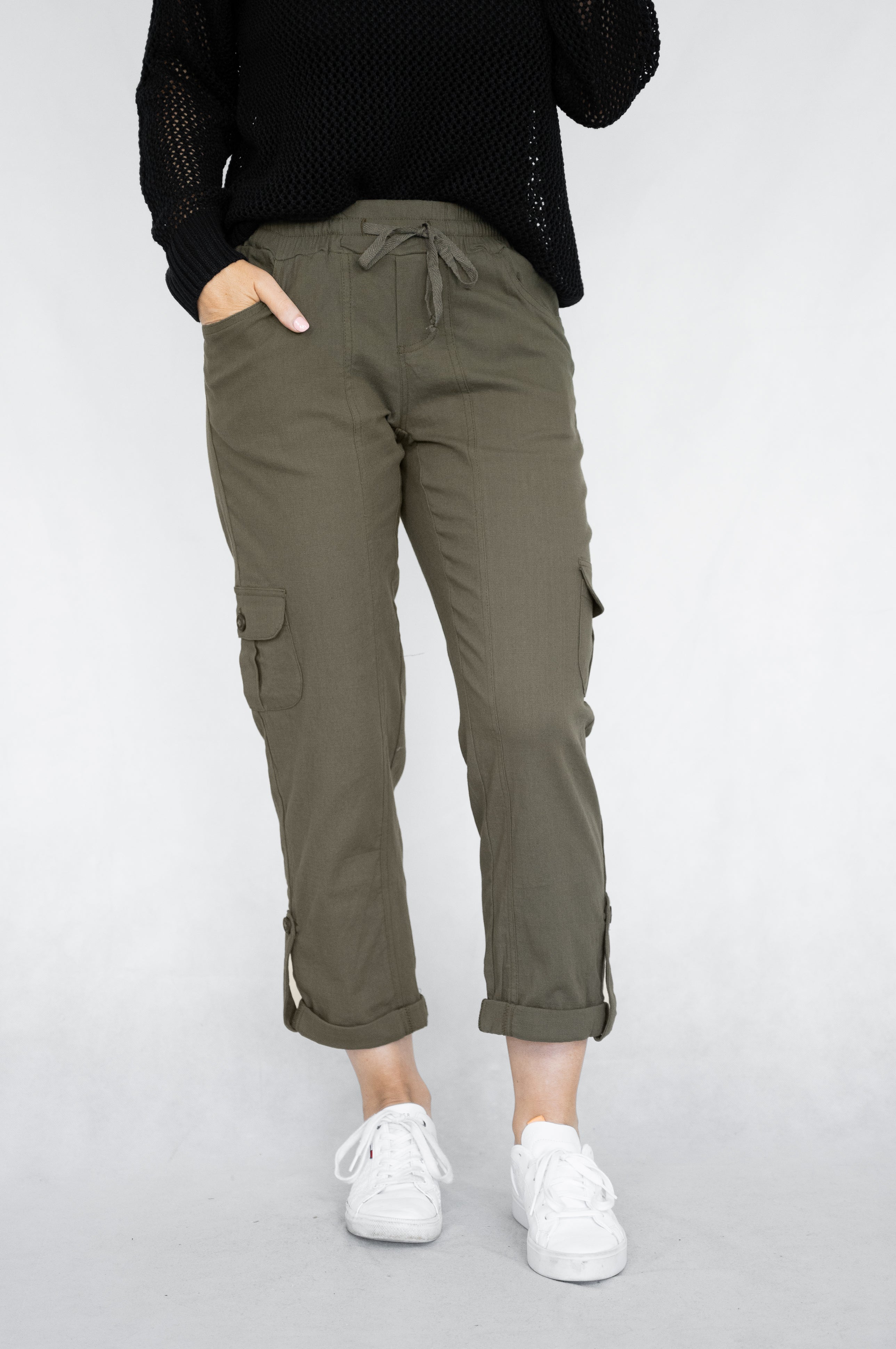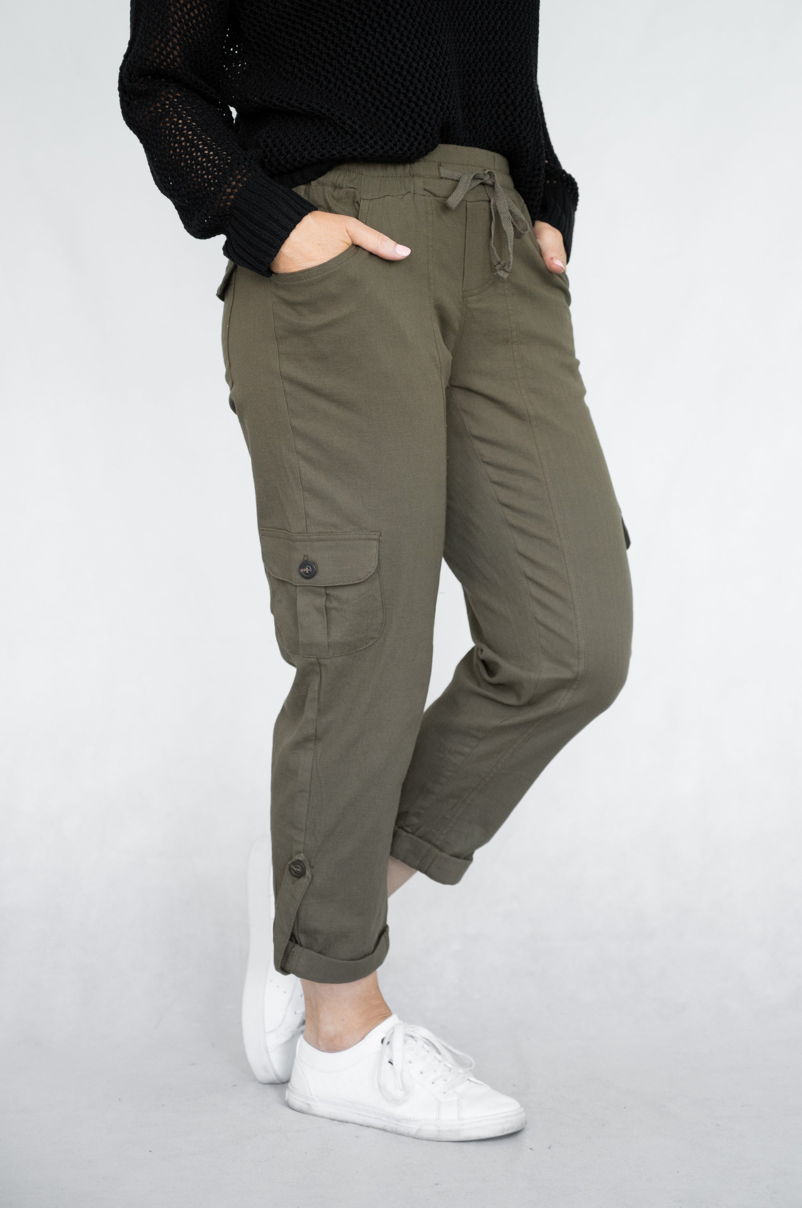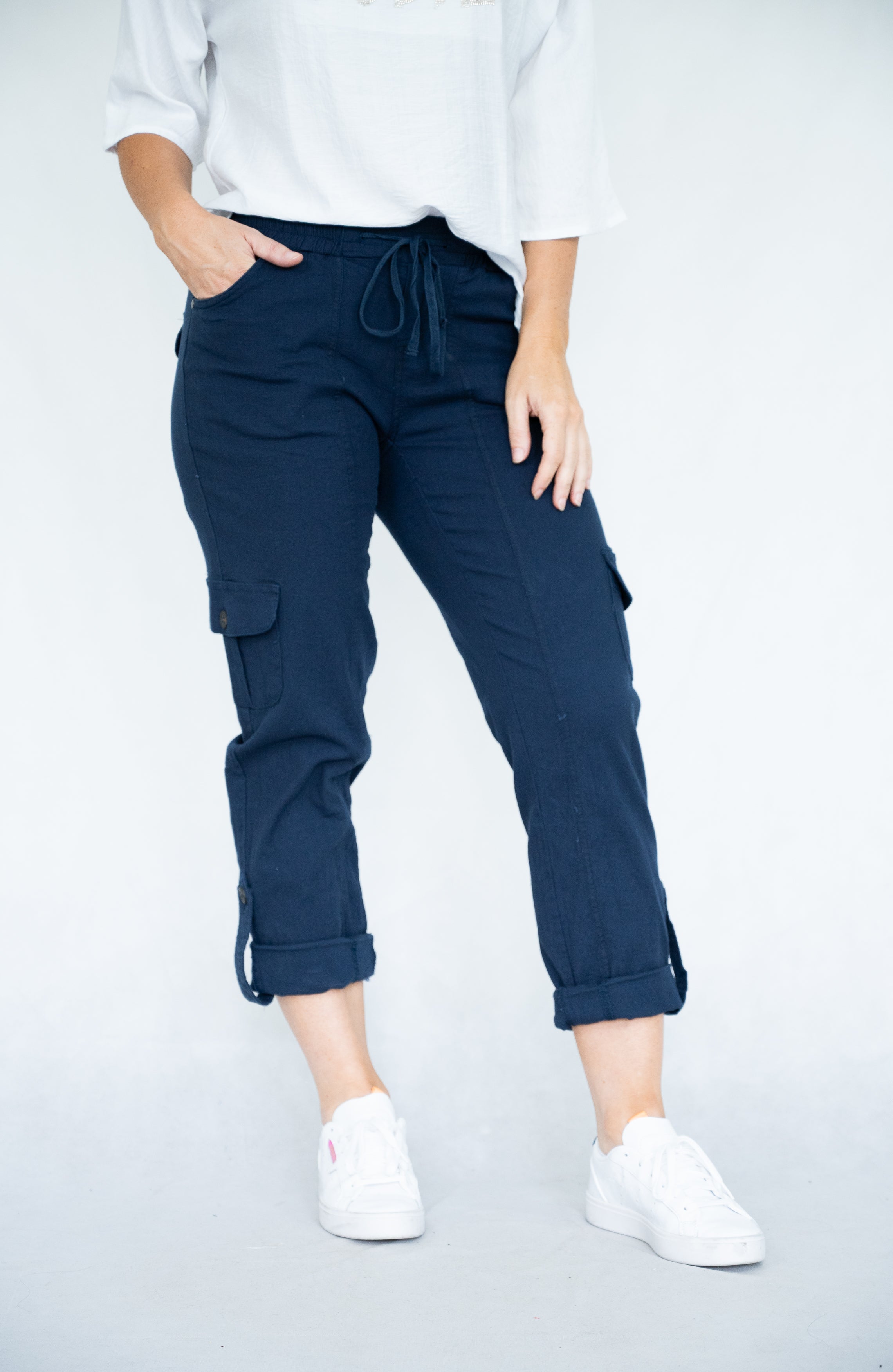 Effortlessly cool and endlessly versatile, the Missy Q Stretch Cargo Pants have arrived – perfect for workdays, weekends, or travel. Crafted from a breathable linen blend with a touch of stretch, these relaxed tapered pants combine comfort with a utility-inspired edge. The elastic waistband with drawstring ensures a flexible fit, while the cargo pockets and roll-up tab hems deliver both function and flair. Whether styled full-length or cropped, they’re a staple you’ll reach for again and again.