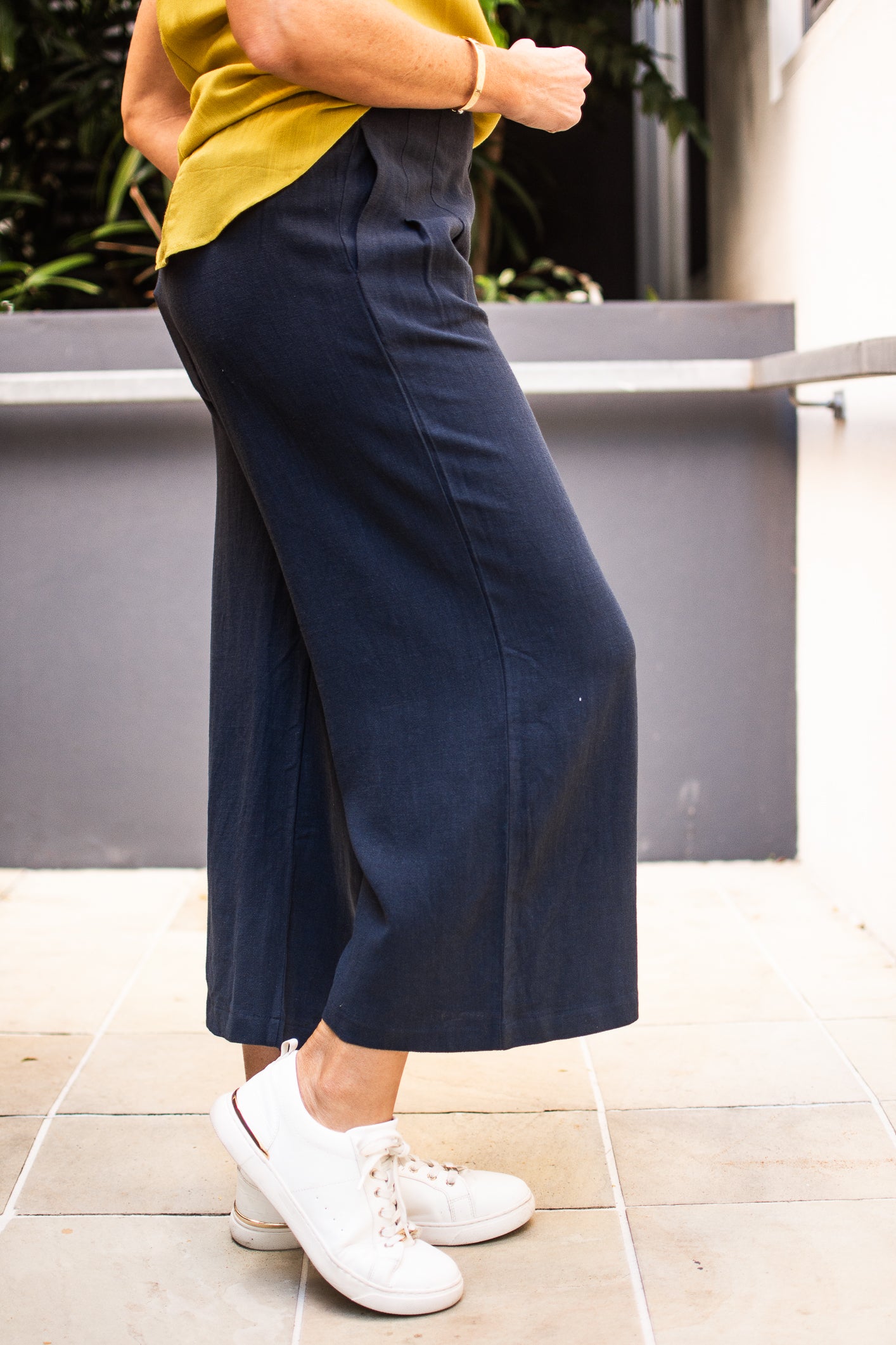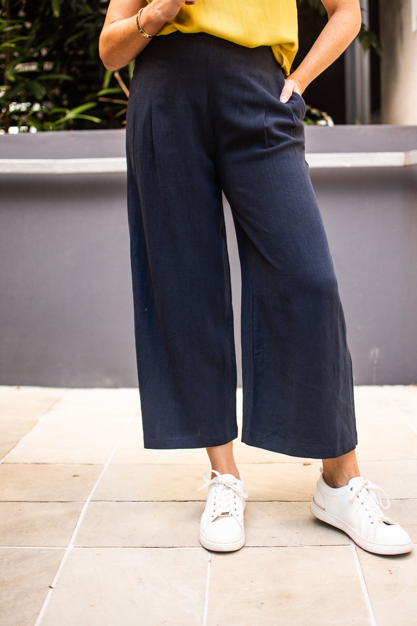 Willow Tree Linen Blend Pleat Detail Full Length Loose Navy Pant Navy 8