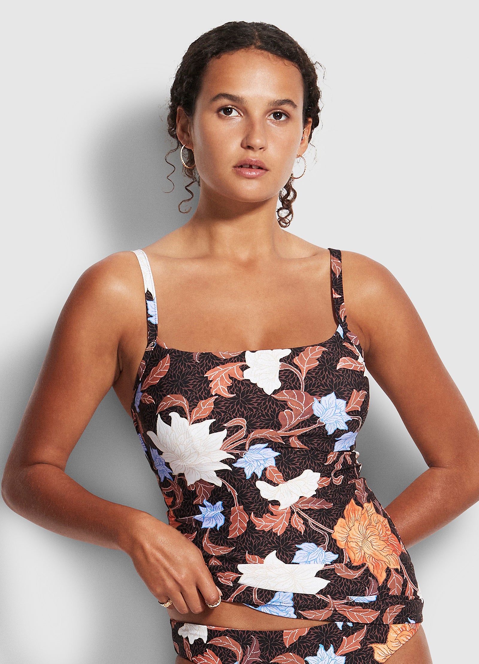Seafolly Boheme DD Singlet is crafted for all-day support and comfort. This feminine DD swimwear top offers extra coverage, a shelf bra and convertible-adjustable straps.