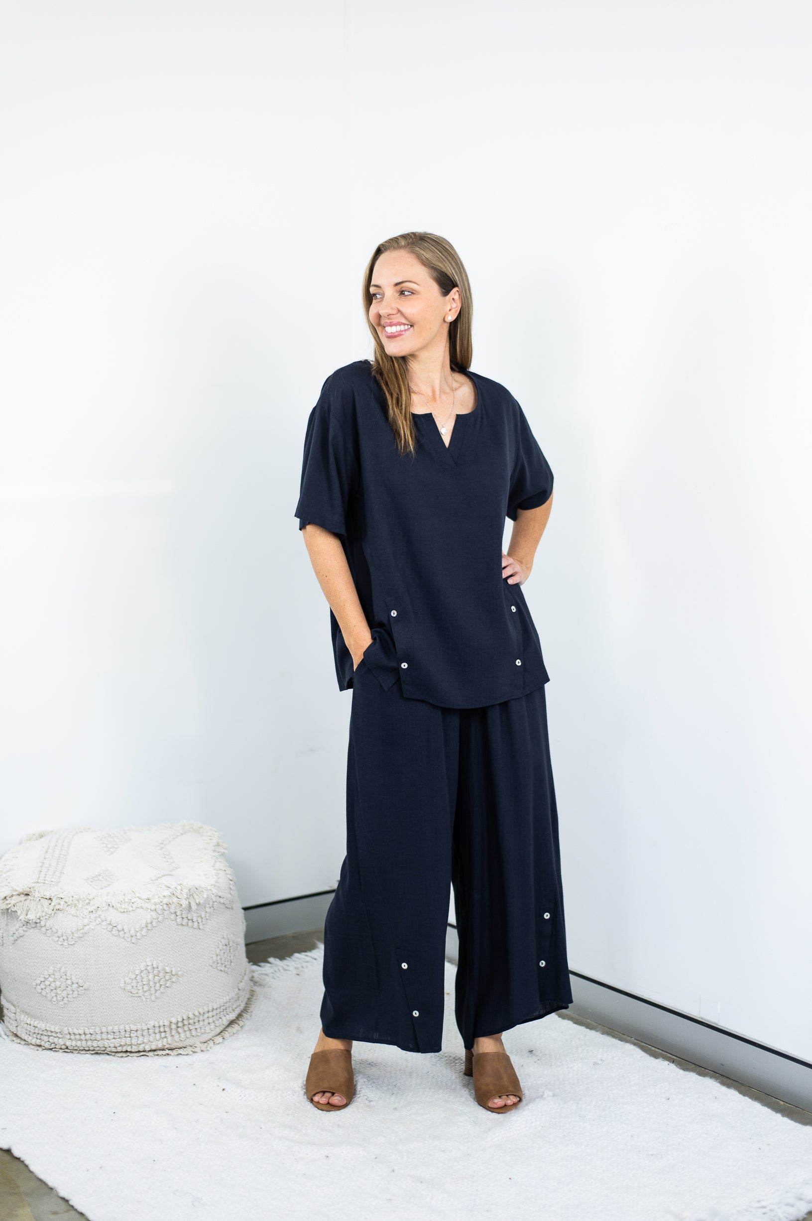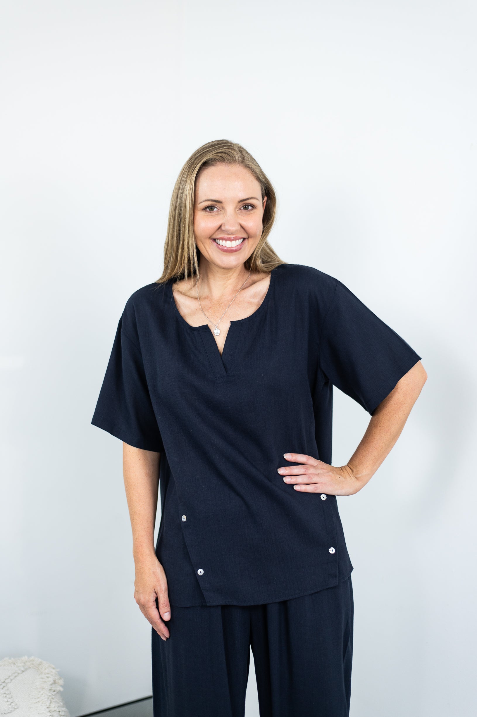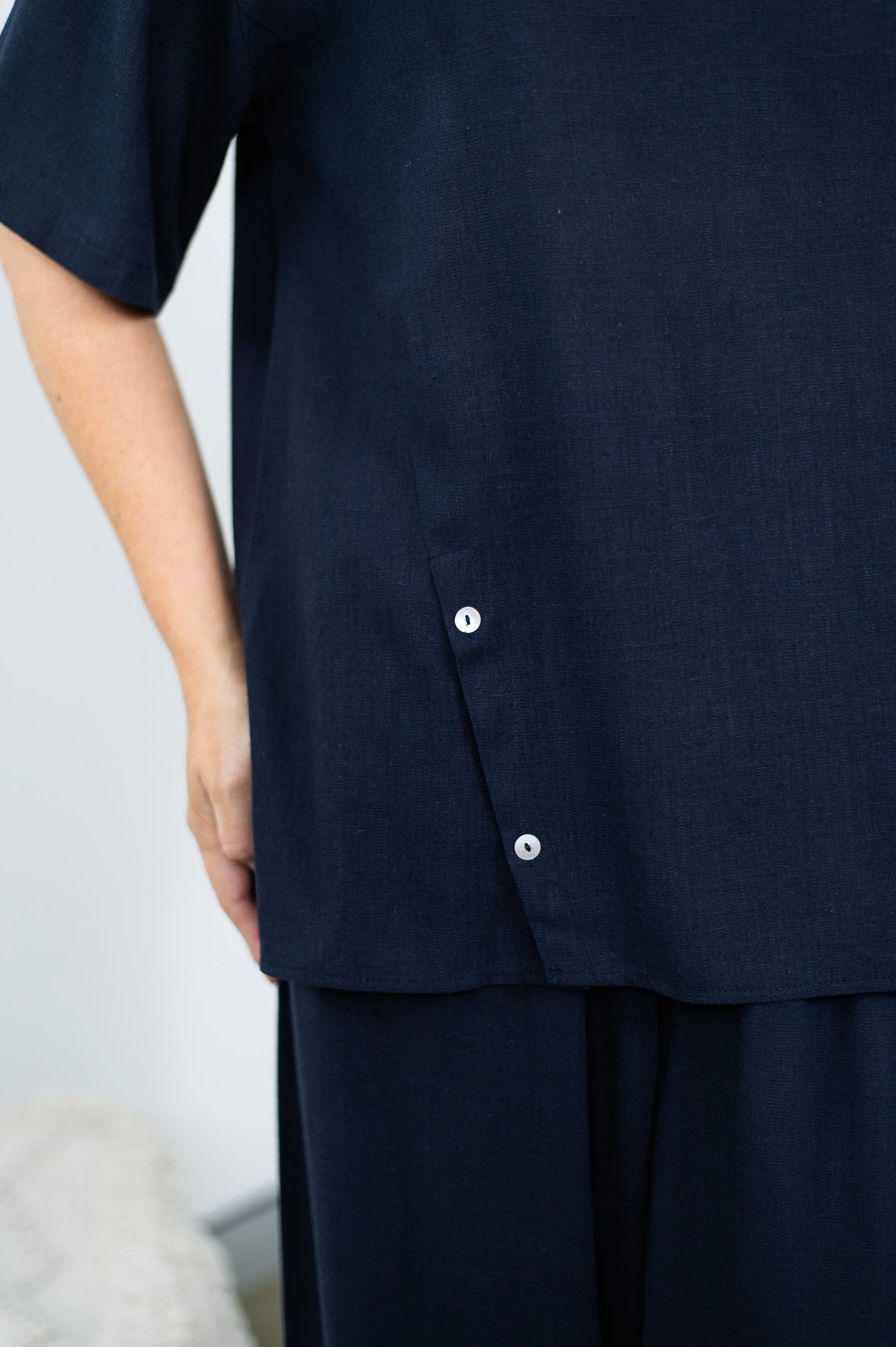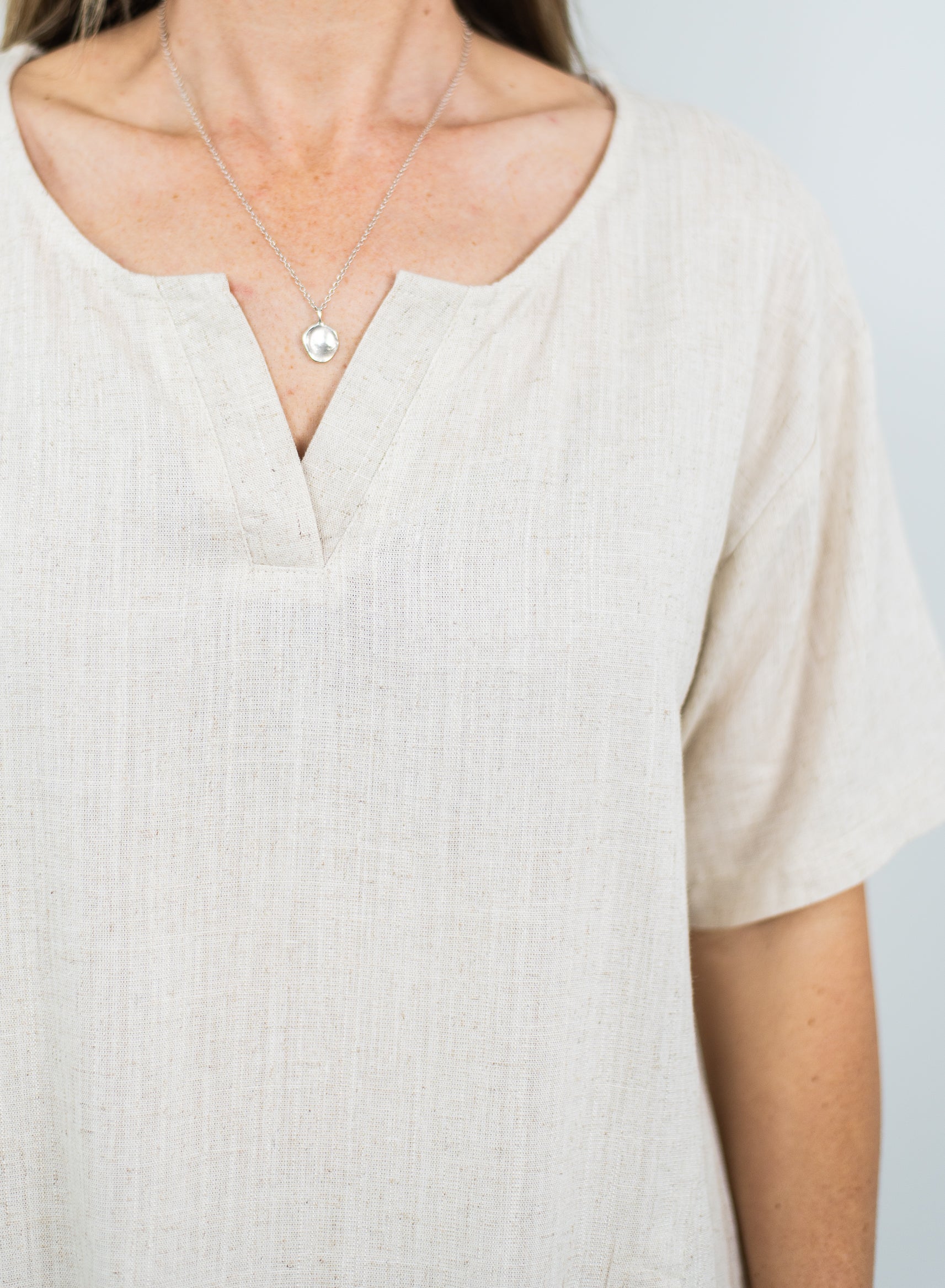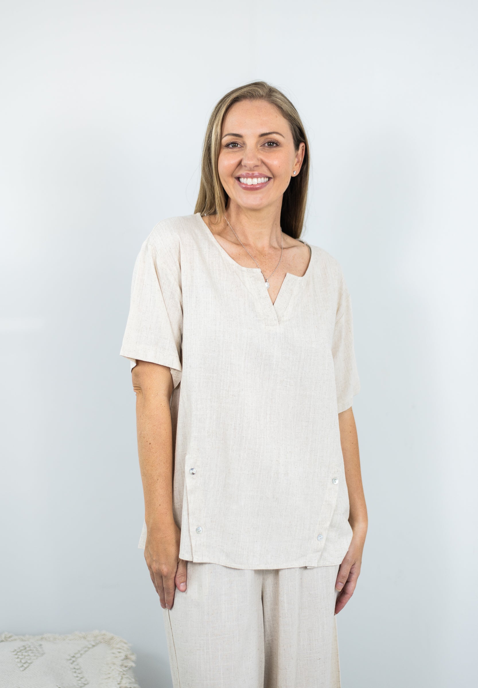 Slip on some summer fun with our Jolie Saule Linen Top! Made from airy linen, this v-neck top is perfect for warm weather. With its short sleeves and button detailing, you'll stay cool and stylish all season long. Grab one now and embrace the sunshine.