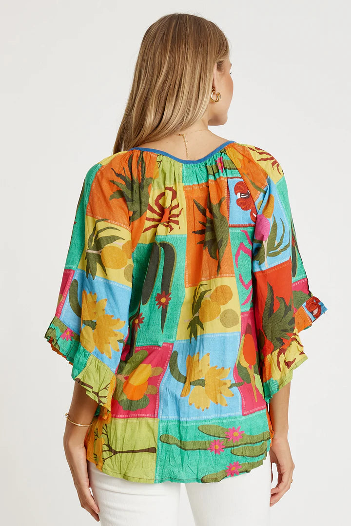 Brighten your wardrobe with this playful cactus print top featuring a relaxed, effortless silhouette. The adjustable V-neck ties and decorative tassels add a charming touch, while gentle gathers flow from the neckline. Wide raglan sleeves with flouncy hems and three-quarter length create movement and style. The curved hemline completes the laid-back vibe—perfect for casual days with serious personality.