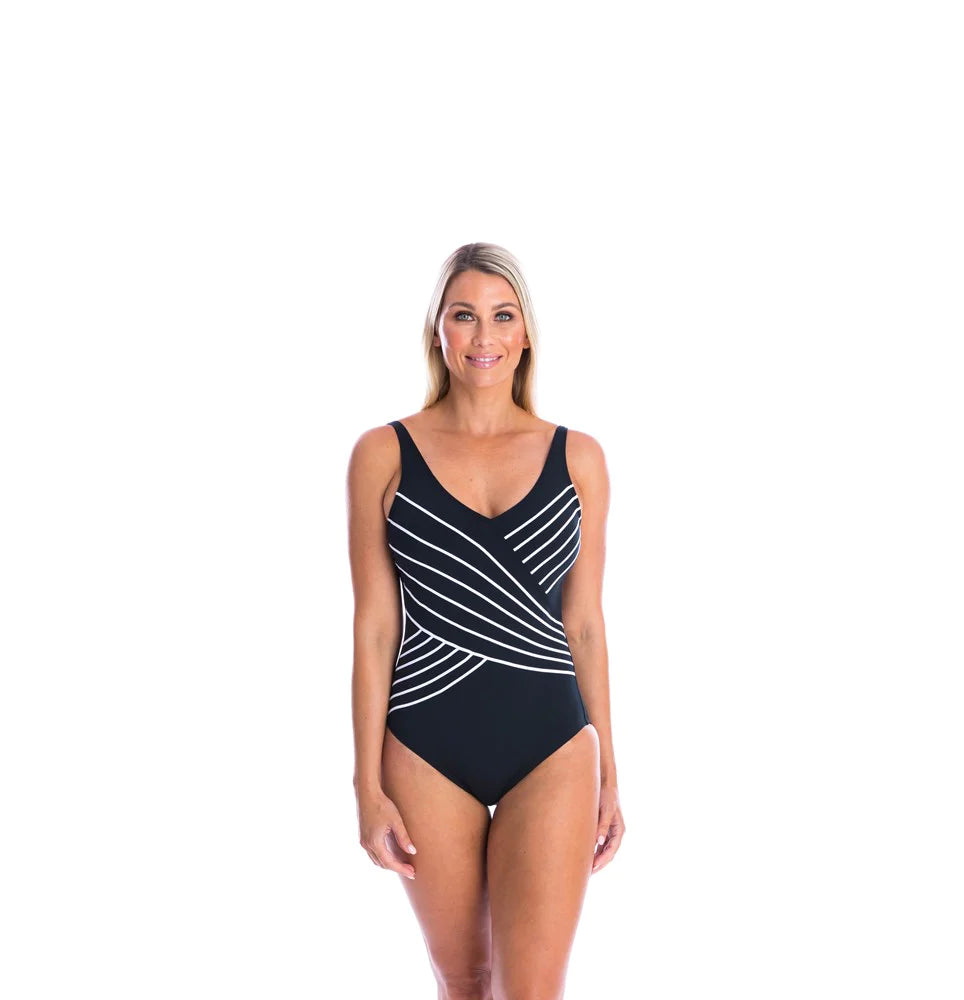 Black Cross Over V Neck Pool one piece with white binding detail.
