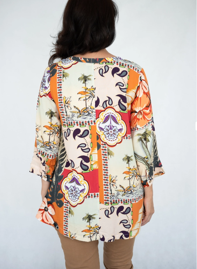 This Jolie Saule Top in Autumn Florals brings a warm and vibrant update to your wardrobe with its rich floral design in shades of orange, red, and purple, set against a soft cream base. This top offers both comfort and style, featuring a relaxed silhouette, a flattering V-neckline, and button details for an elegant touch. Made from lightweight, breathable fabric, it’s the perfect piece to wear for both casual outings and dressier occasions, providing an effortlessly chic look.