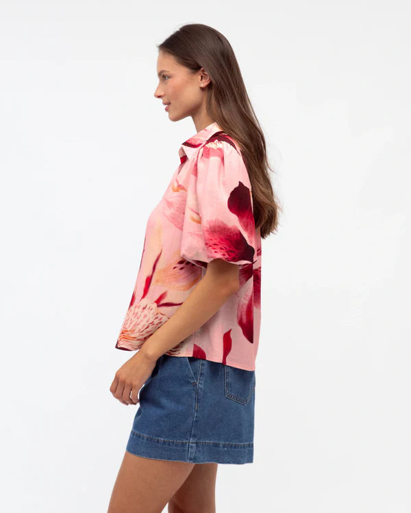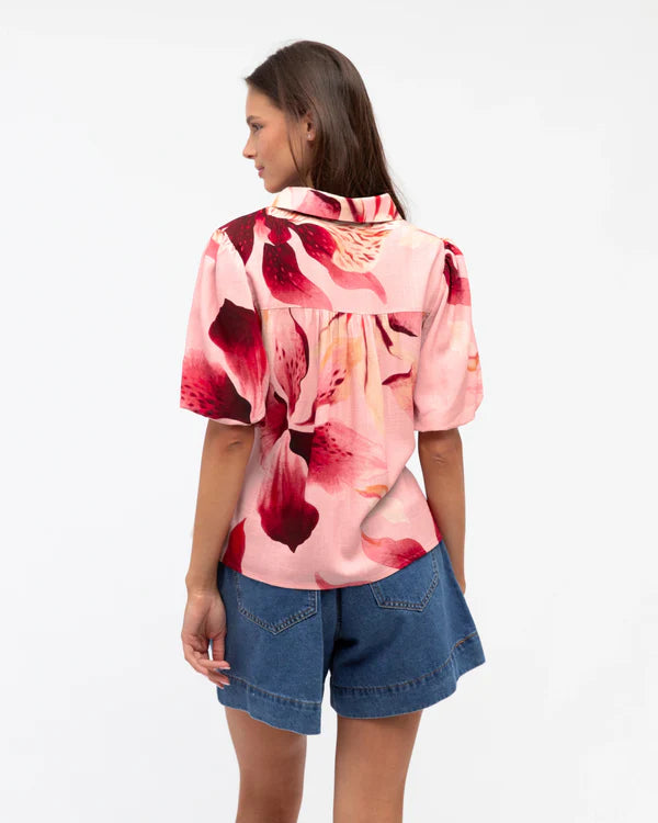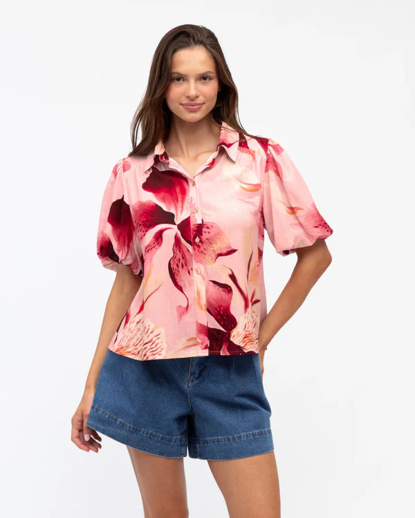 This refined linen blend shirt seamlessly balances comfort with understated elegance. Featuring a structured collar and subtle gold button accents, it exudes quiet sophistication. The graceful half-length puff sleeves introduce a touch of romance without compromising its polished aesthetic. The streamlined cut flatters the silhouette while the breathable fabric ensures all-day ease. A versatile piece that transitions effortlessly from casual to refined occasions.