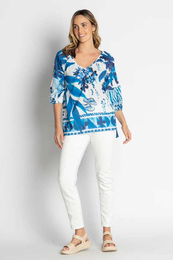 The LulaLife Karasi Top is a lightweight and versatile summer essential, designed in Australia and crafted from breathable 100% cotton. Featuring a flattering V-neckline with soft gathers, this relaxed top is styled with wide raglan ¾ sleeves finished with elastic hems for comfort and ease. Side splits add movement, while the vibrant tropical digital print brings a fresh, effortless look. Perfect for pairing with shorts, skirts, or pants, this cotton top is ideal for casual days, holidays, or warm-weather outings.