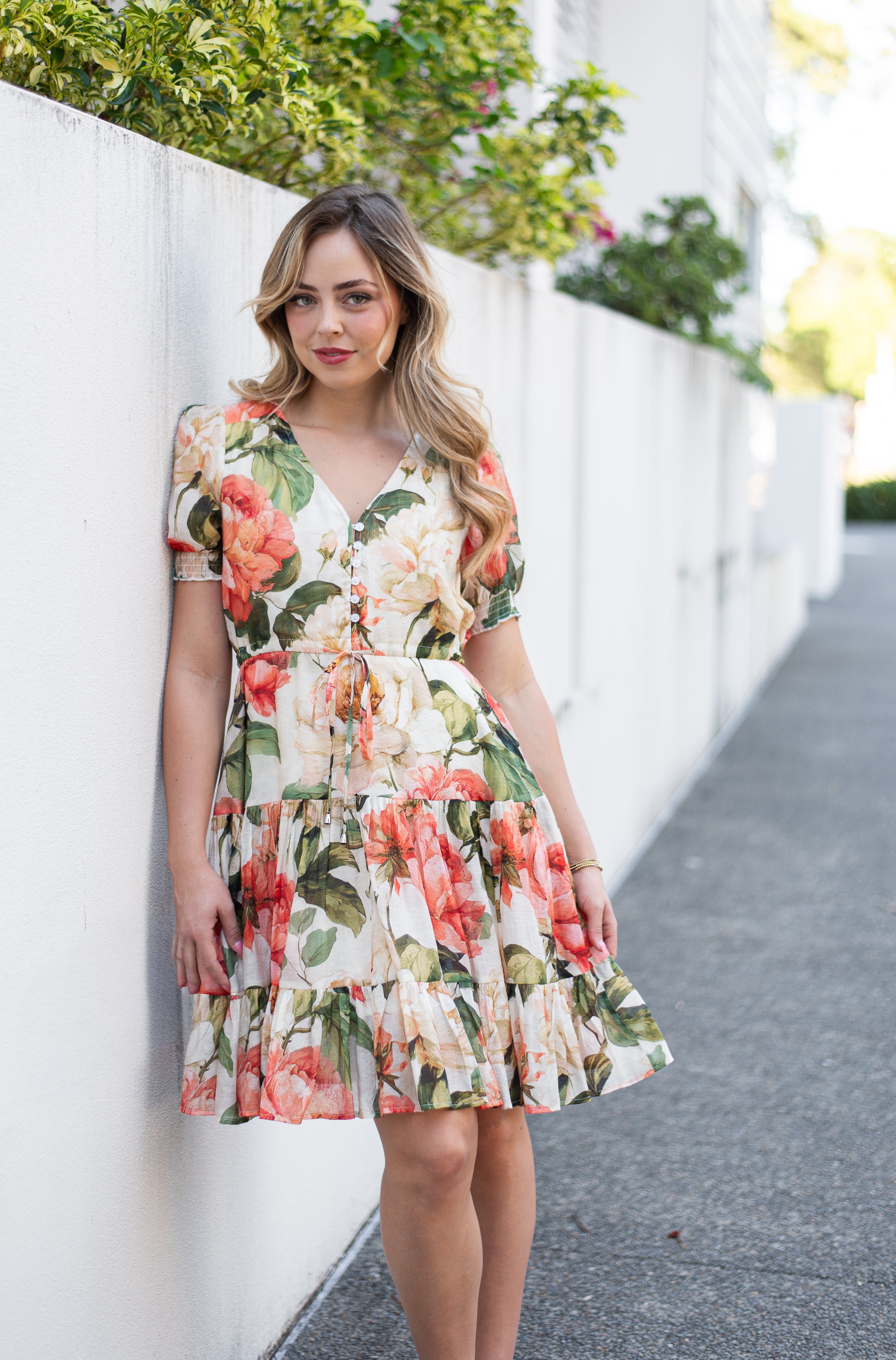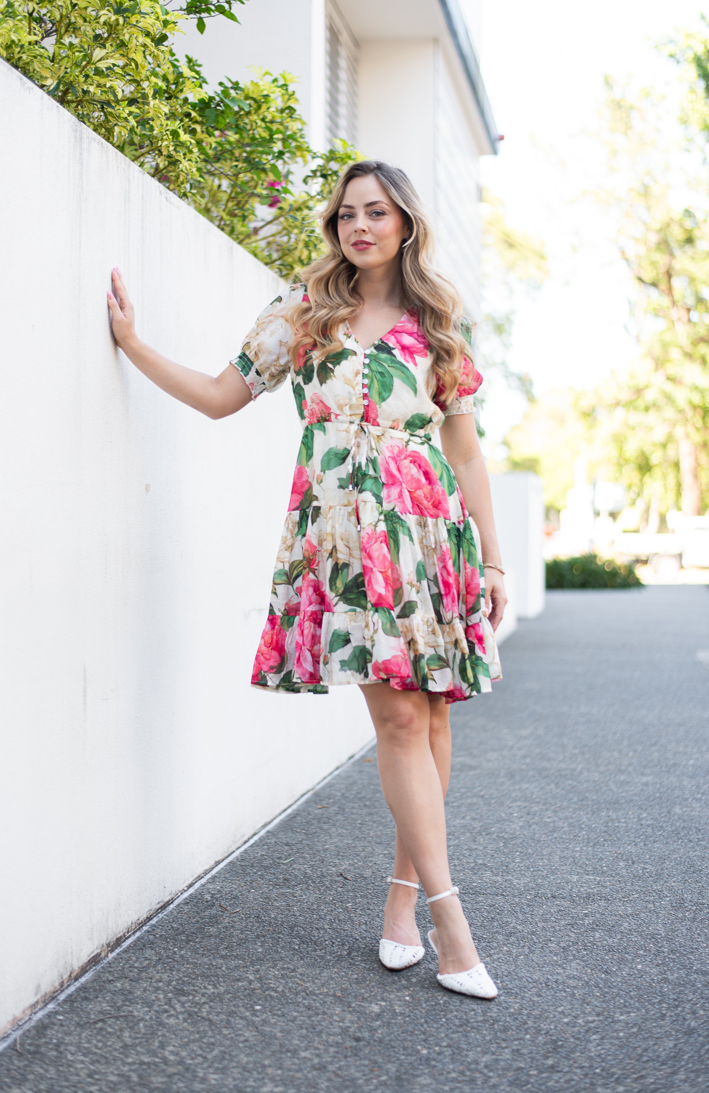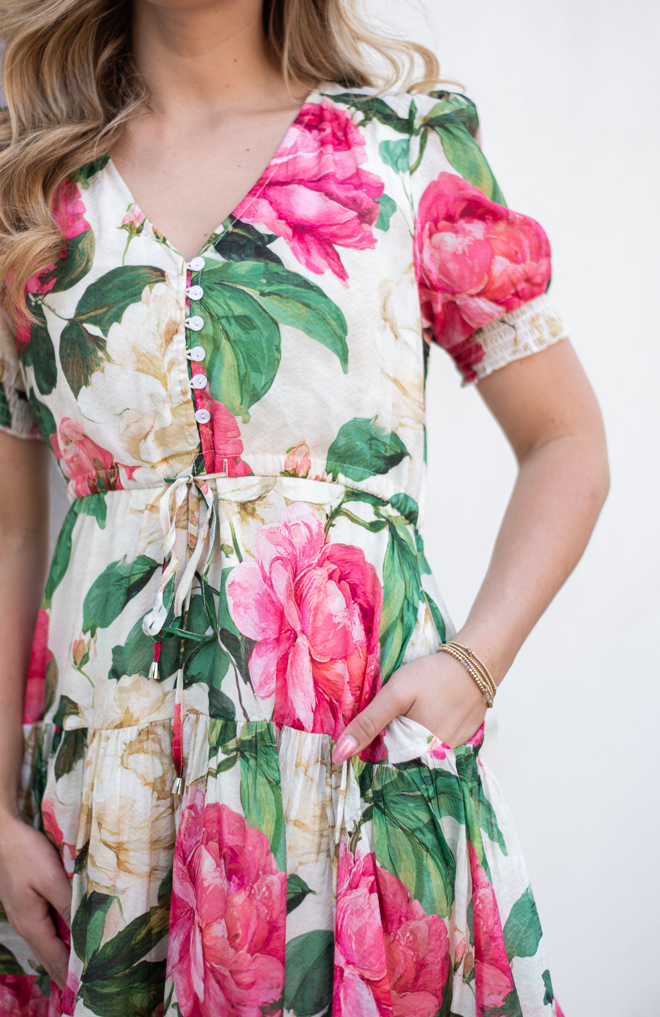 Effortlessly charming, this floral dress brings a splash of colour to your everyday wardrobe. The relaxed v-neckline and short elasticated sleeves create a breezy silhouette, while the drawstring waist lets you cinch it just right. Fully lined for comfort and confidence, it's the perfect piece for casual outings or weekend adventures. Dress it up or down—this versatile beauty does it all.