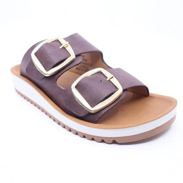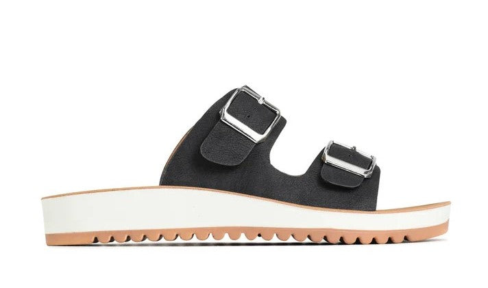 Elevate your style with the Naara Sandals. These classic slides feature double adjustable buckles and a low wedge heel, combining timeless design with modern comfort. Enjoy all-day support with built-in arch support and the luxurious feel of vegan leather.