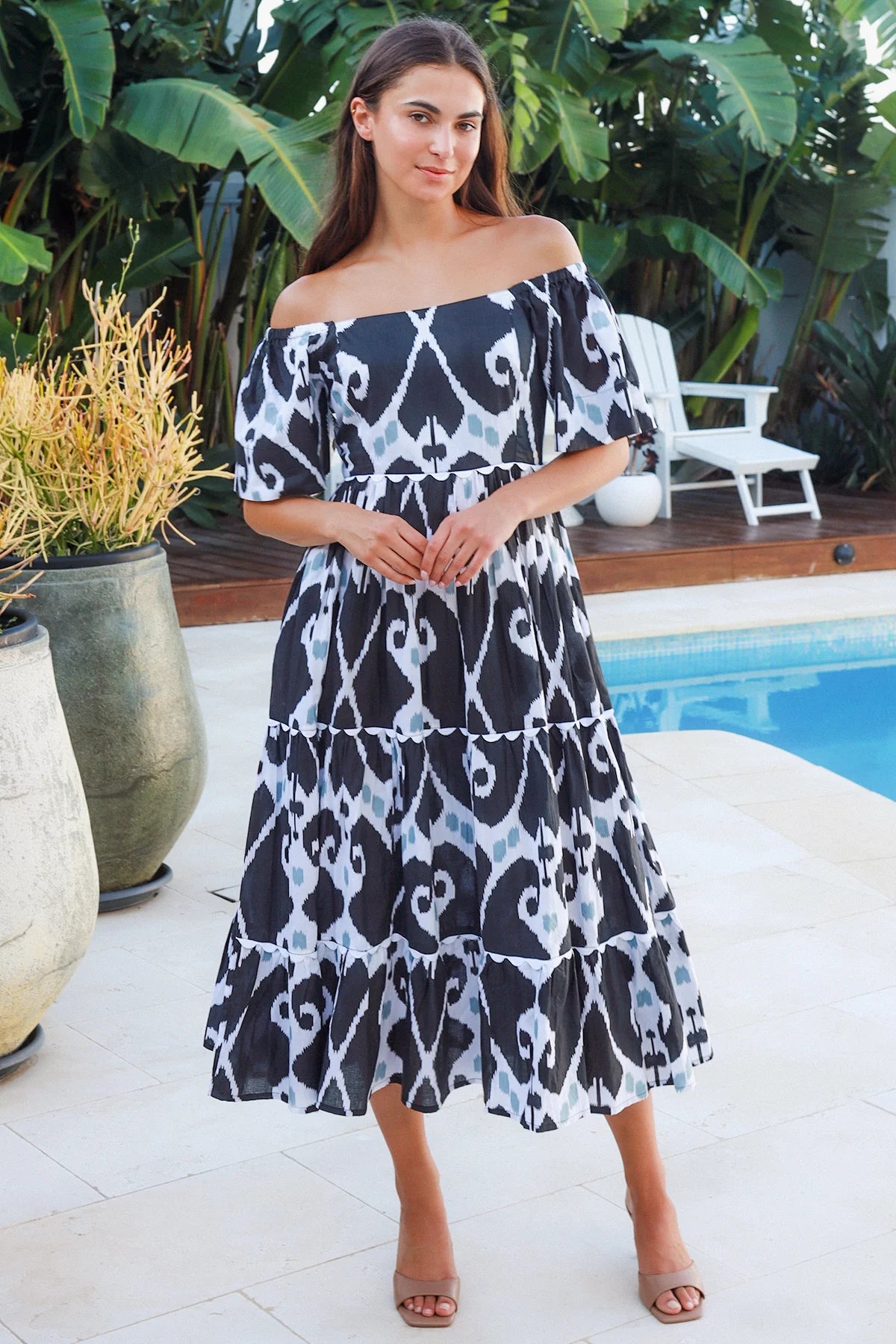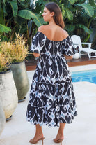 Wear it on or off the shoulder—this peacock-inspired midi does the heavy lifting for you. The elastic neckline shifts your vibe instantly, while half sleeves and an empire-line waist keep things flattering and fun. White cotton lace trim adds texture through the tiered skirt, and hidden side pockets mean you're actually sorted. A shirred back panel ensures comfort without compromise. Bold ikat print in black, white, and powdery blue-teal makes this dress impossible to ignore.
