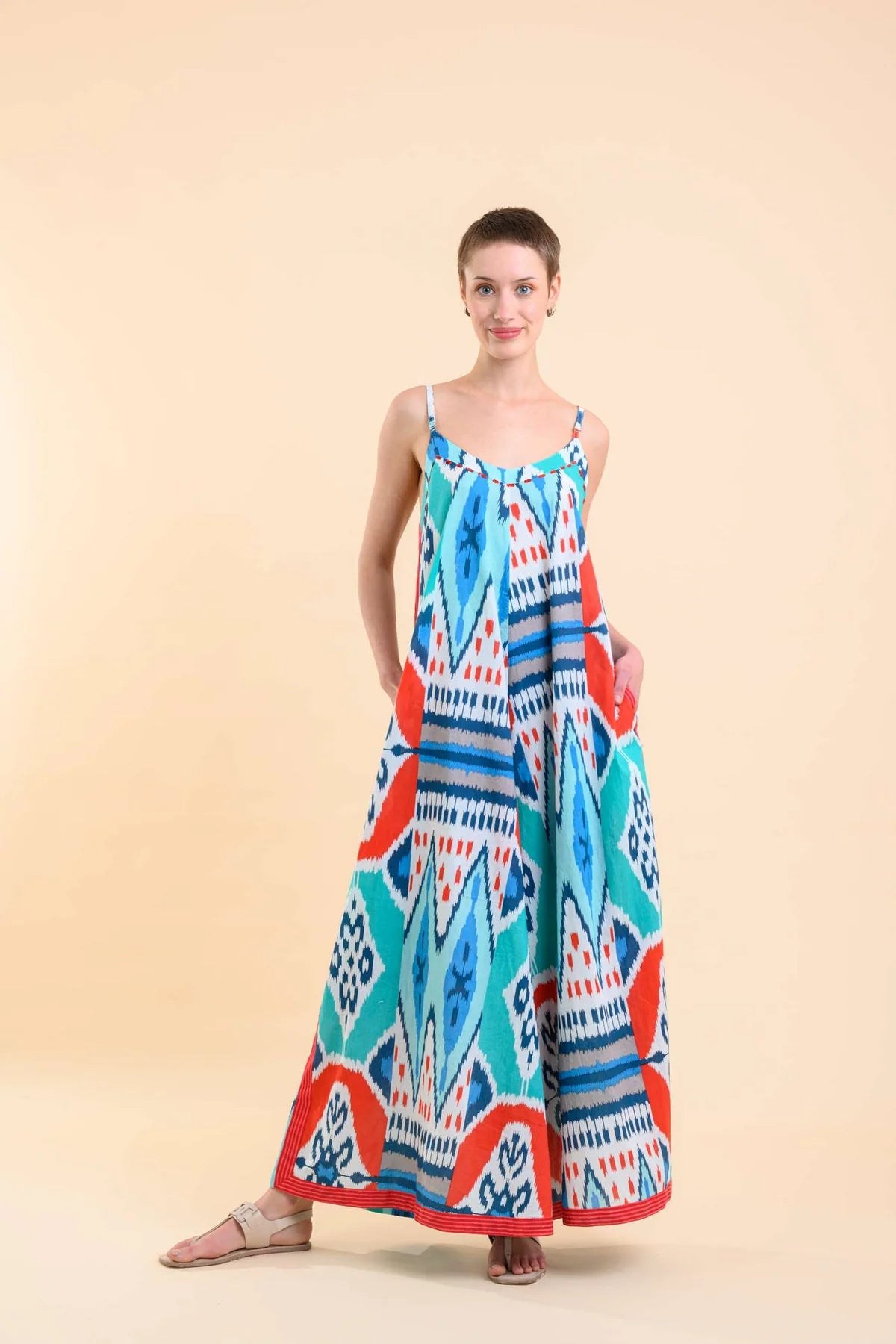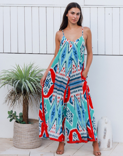 Peacock Feather's Rio is a striking and playful oversized jumpsuit - perfect for anyone looking for a daring change from the usual sundresses. Spaghetti straps lead to a neat V neckline. The relaxed bodice falls to a full and relaxed silhouette with wide legs, angled hem and side pockets. Perfect for staying cool and stylish this summer.