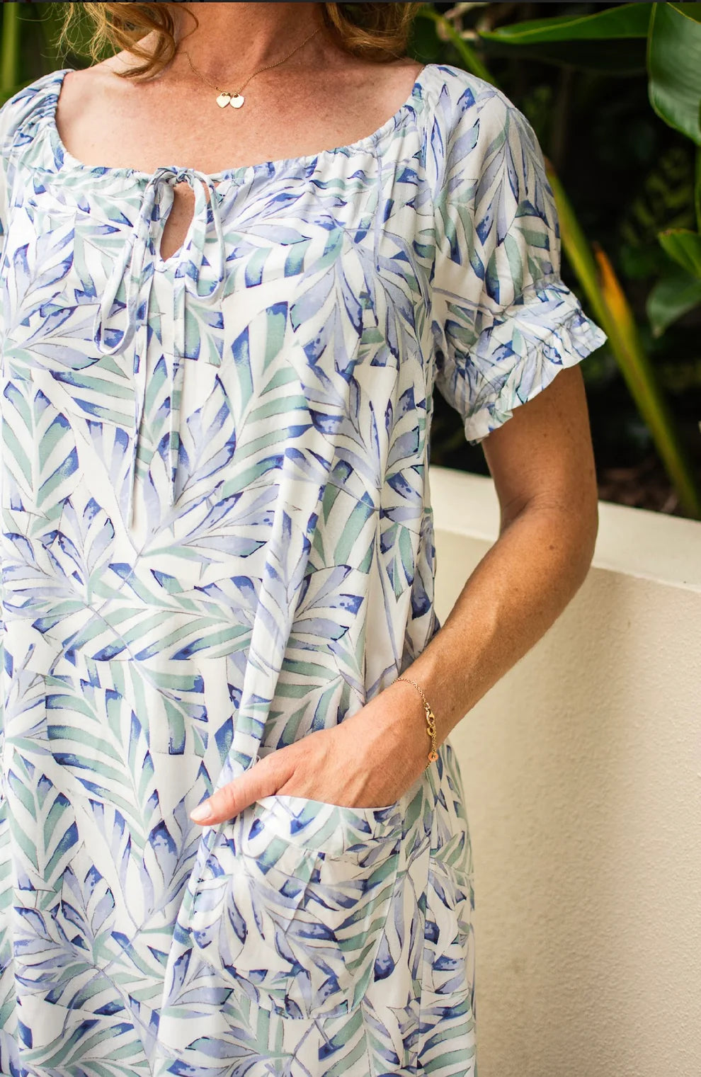 Designed for those sun-soaked days when comfort meets style, this charming mid-length dress features a breezy lightweight fabric that keeps you cool and collected. Playful frilled details on the sleeves and hem add a touch of whimsy, while the tie keyhole neckline brings just the right amount of personality to your warm-weather wardrobe.