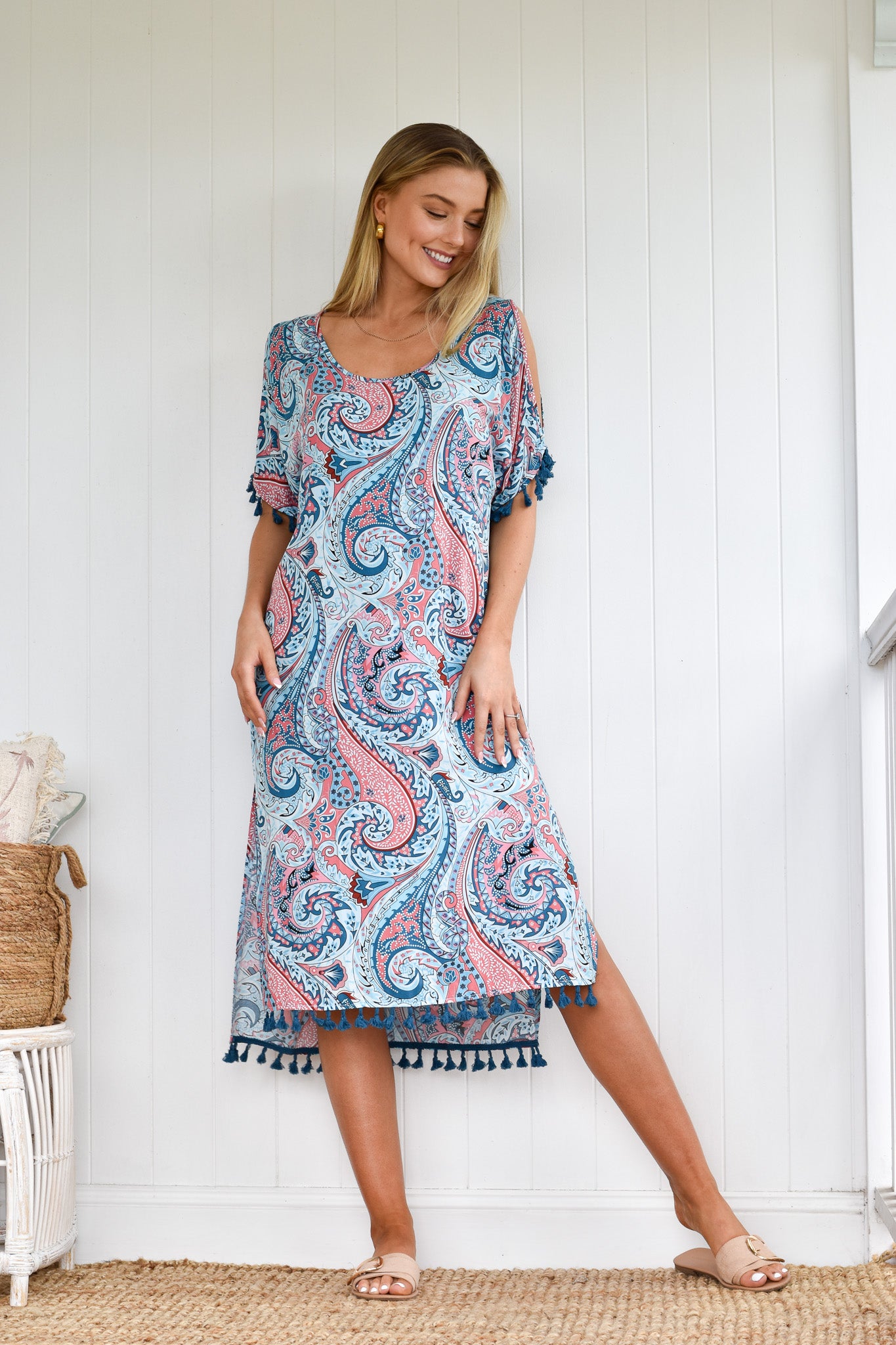 Effortlessly elegant, this midi kaftan features an open shoulder design with a tie-back closure and decorative tassel edging for understated sophistication. https://coastlinefashion.com.au/collections/new-arrivals