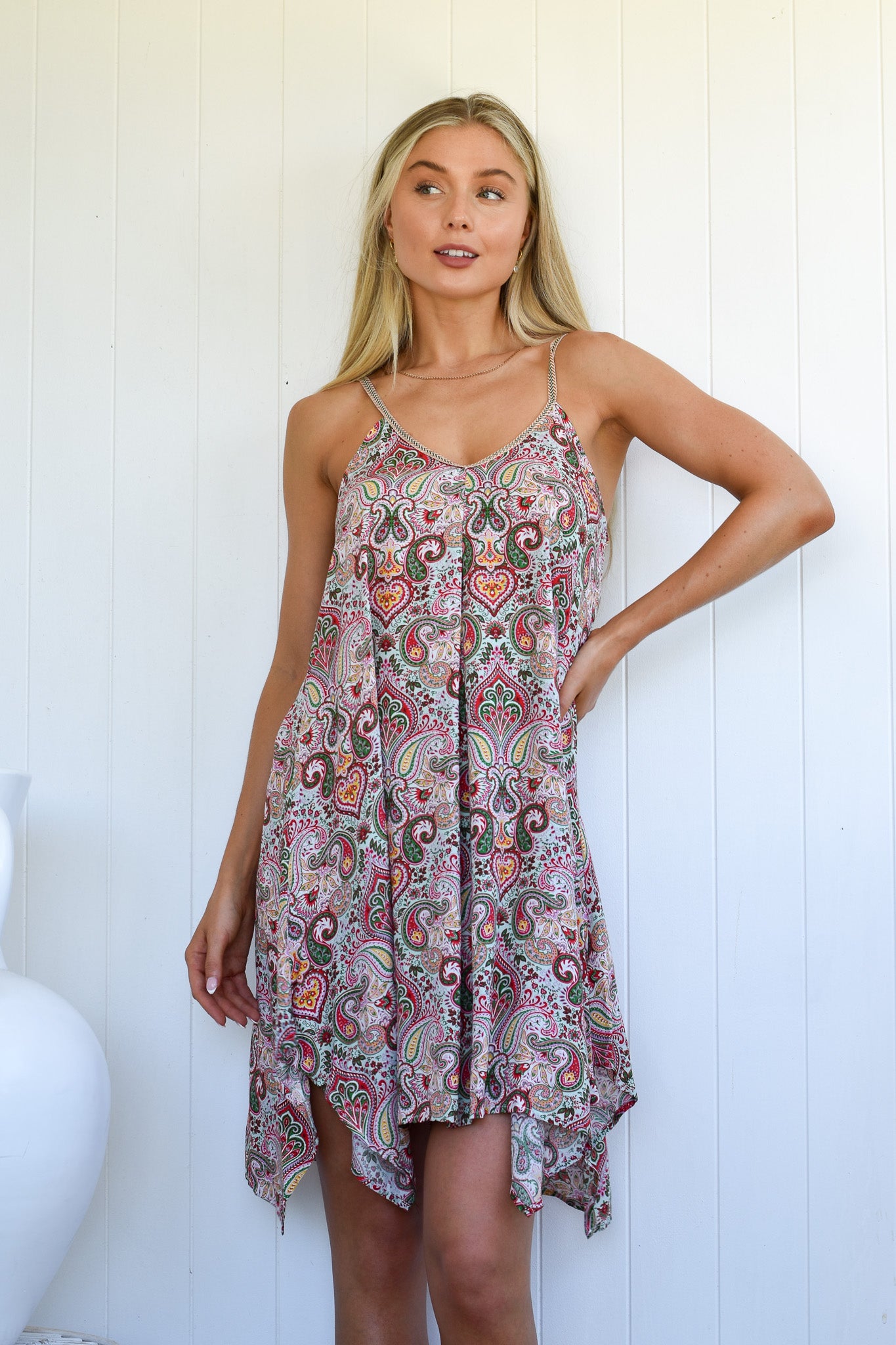Crafted from luxurious rayon, this dress presents a timeless paisley pattern enhanced by delicate embroidered detailing. The strappy cut allows for versatile styling—wear it solo or layered over your favourite swimmers for a polished beach-to-brunch. The irregular hemline adds an element of casualness, while the breathable fabric ensures you stay cool and composed throughout the day.